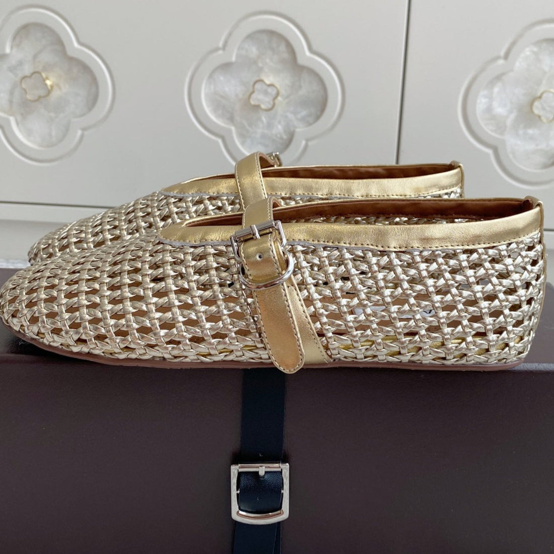 Alaia 25 Mary Jane Mesh Ballet Flats Black Gold Calfskin