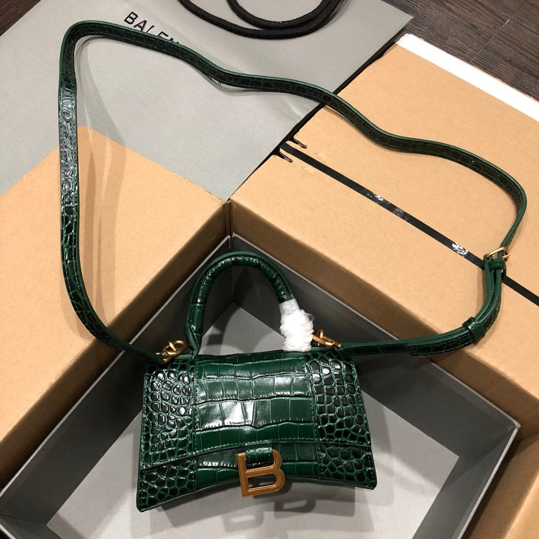 Balenciaga Hourglass bag dark green crocodile skin