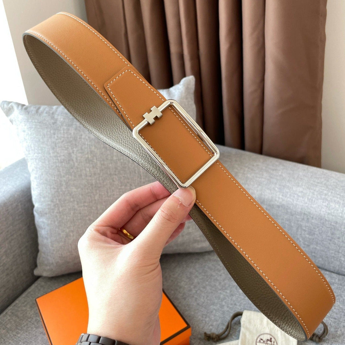 H TUBE BELT 38MM SILVER BUCKLE TIN GREY GOLD LEATHER