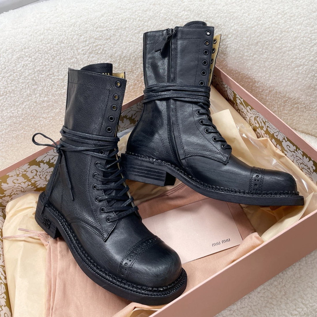 Miu Short Wool Boots Black Open-Hemmed Cowhide