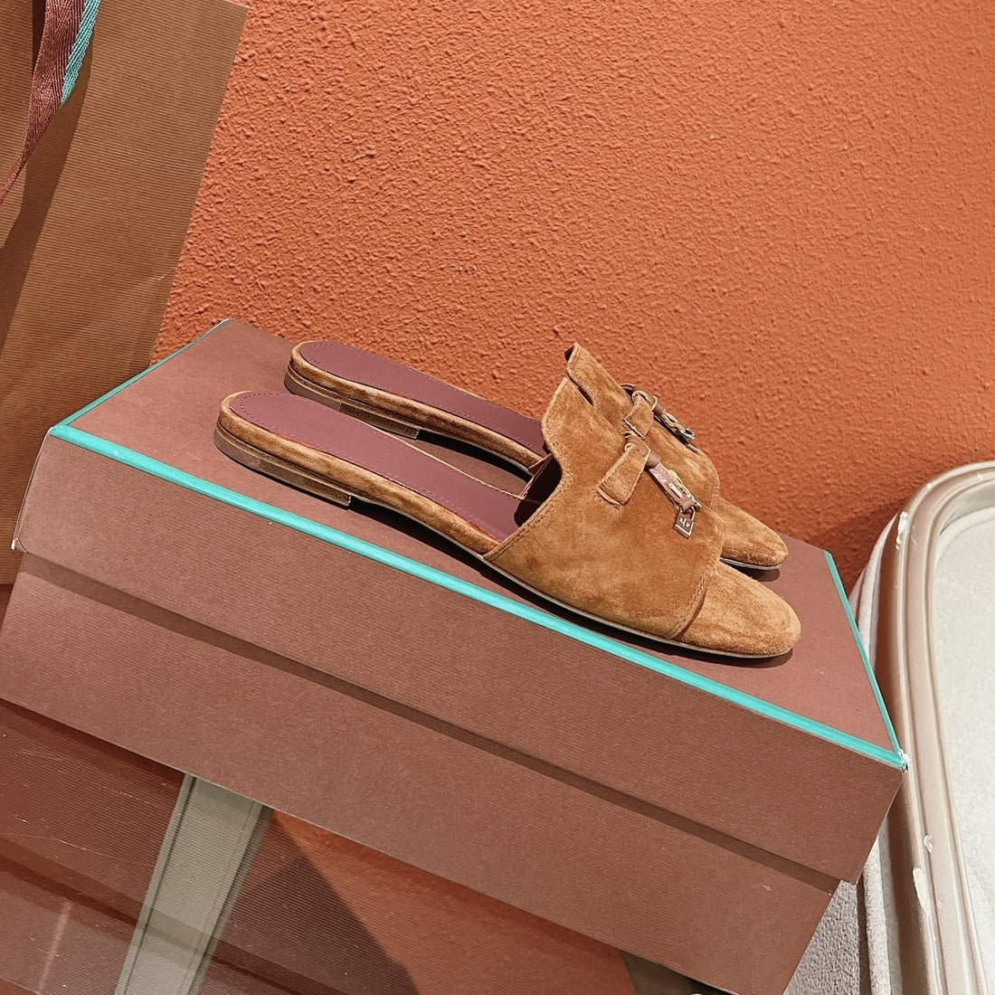 Summer Charms Sandals in Taupe Suede Maroon Lambskin