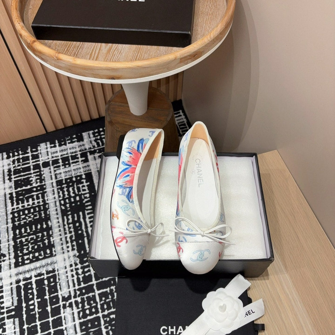CC Ballet Flats White With Camellia Black Lambskin