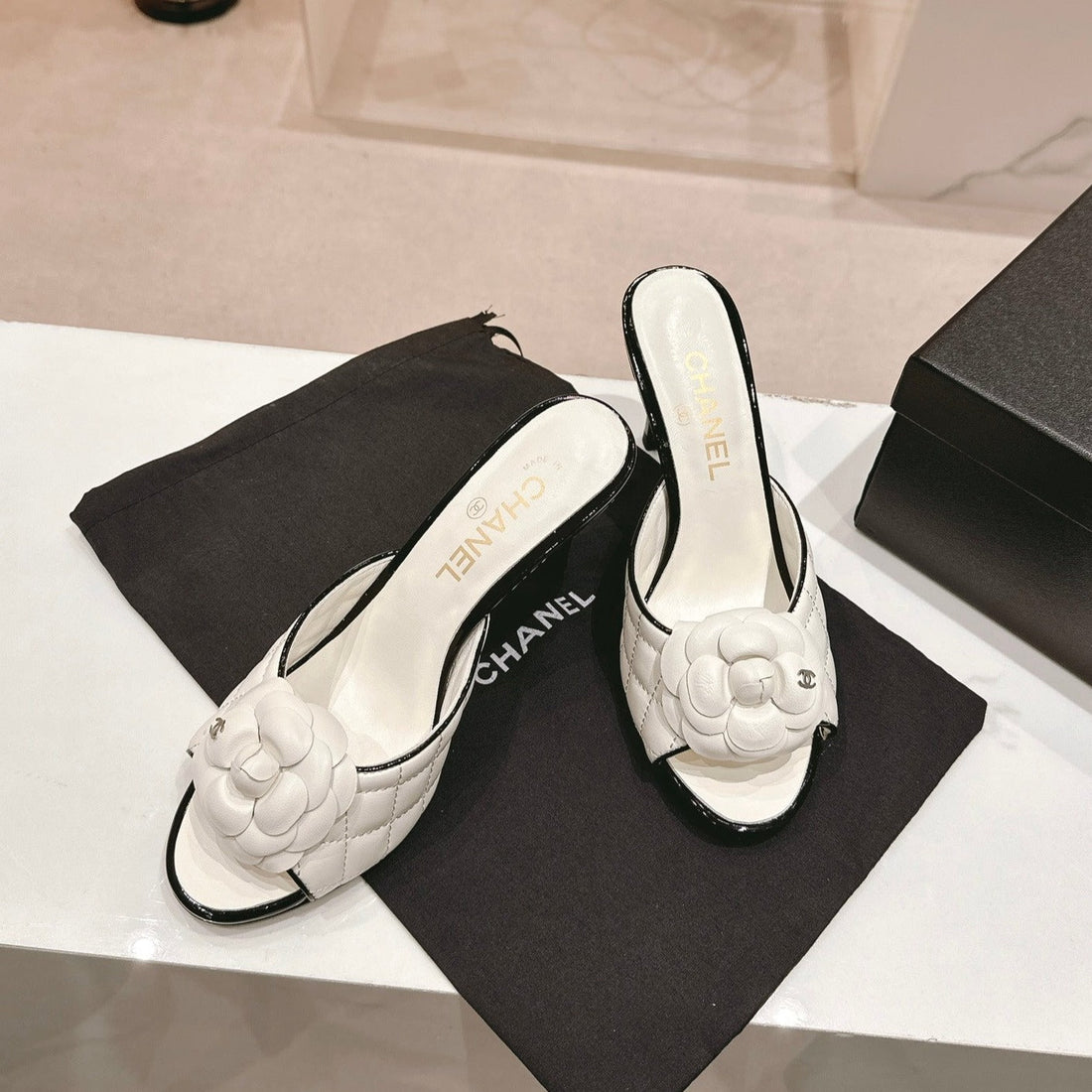cc sandal flower white canvas black calfskin