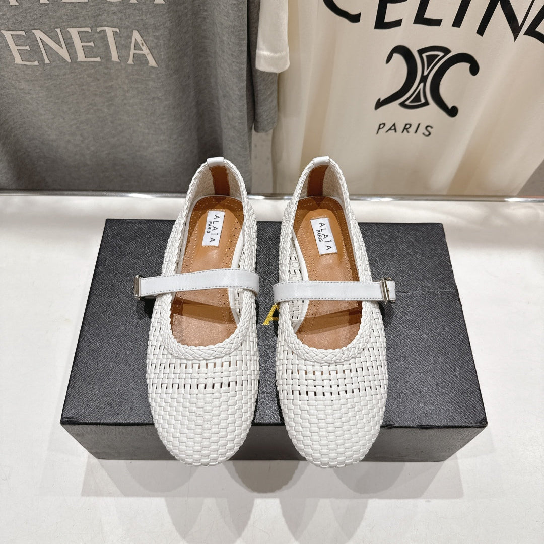 ALAIA MARY JANE FLATS white mix beige woven calfskin pattent