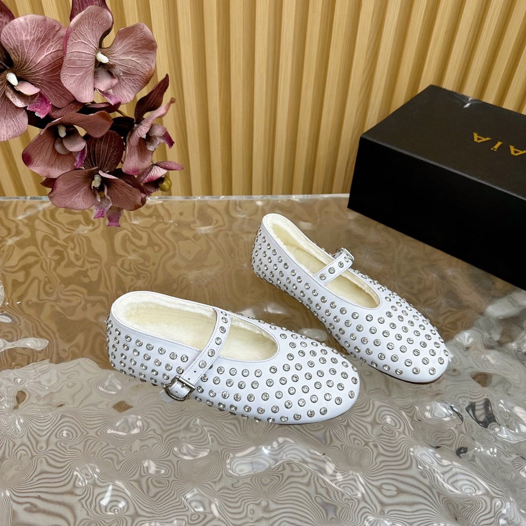 Alaia Strass Ballet Flats In White Calfskin With Fleece Lining 926039