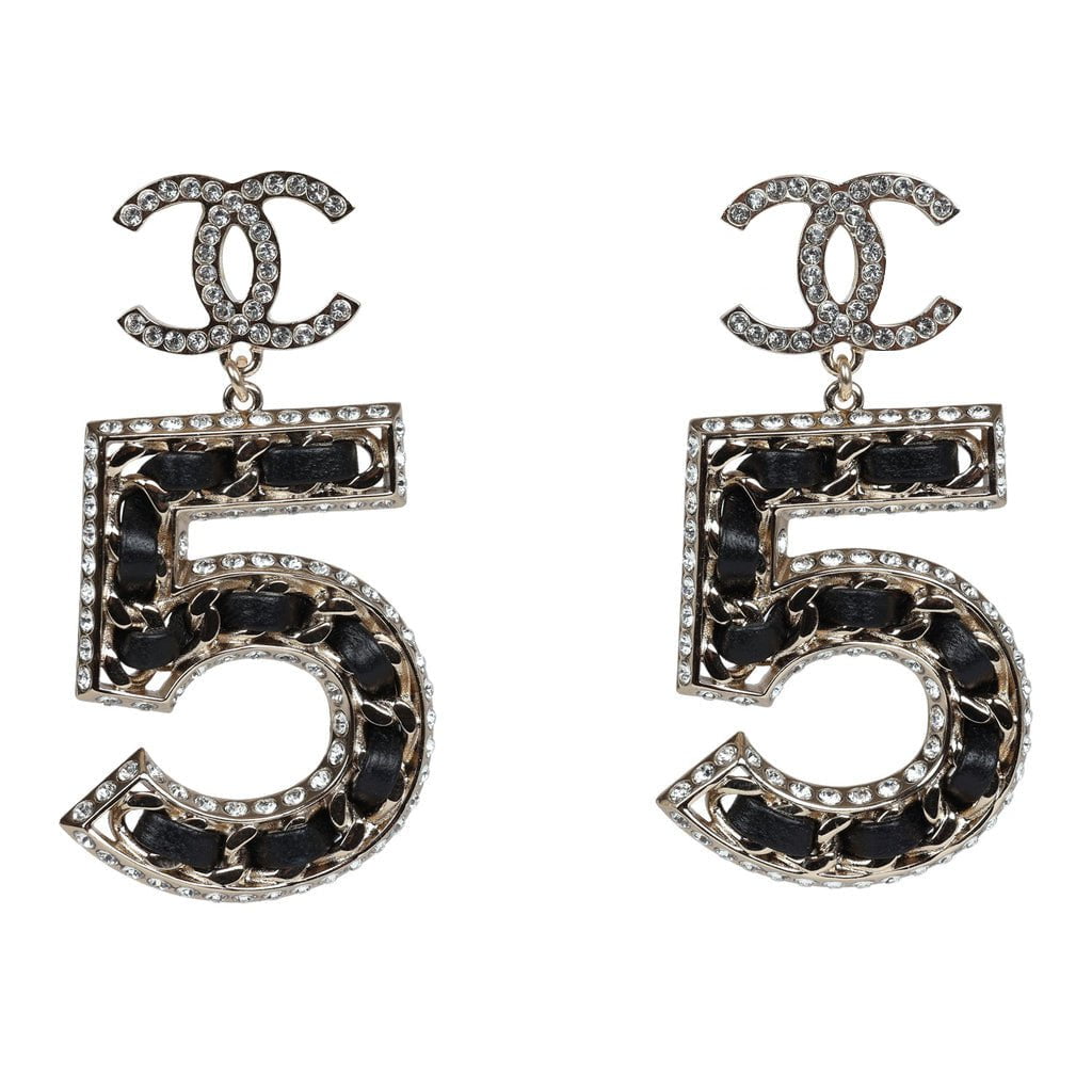 Chanel Crystal CC No 5 Chain Drop Dangle Earrings Black Leather Light Gold Metal
