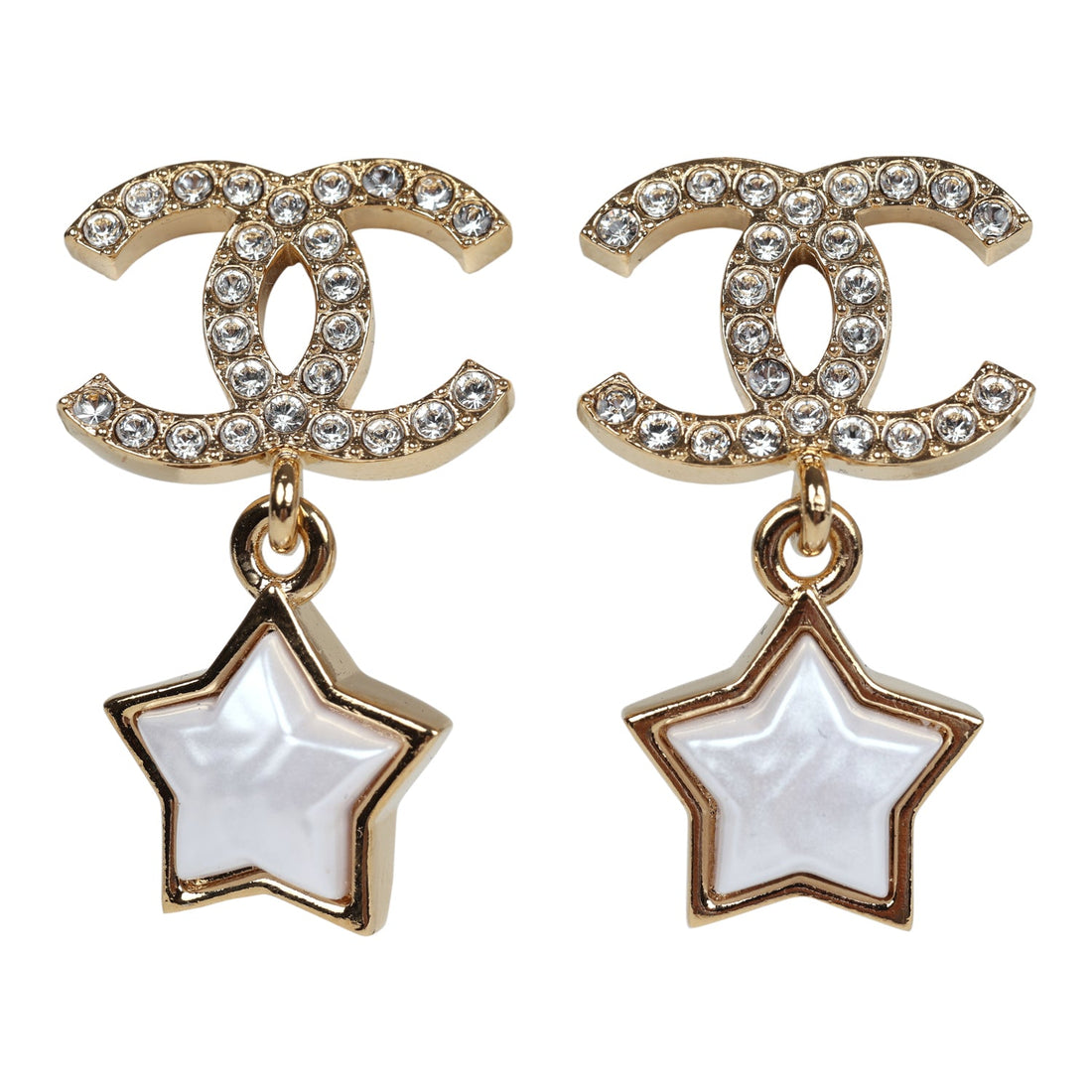 Chanel Crystal and Pearl CC Star Dangle Earrings Gold Hardware