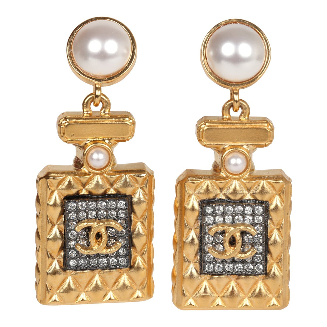 Chanel Crystal Pearl Perfume Bottle Dangle Earrings Gold Hardware