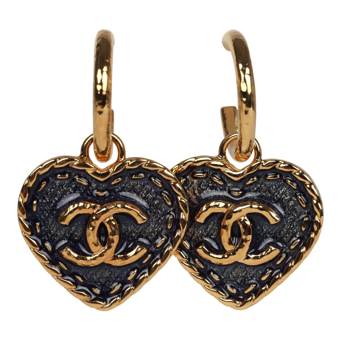 Chanel Gold Hoop CC Blue Denim Heart Dangle Earrings Gold Hardware