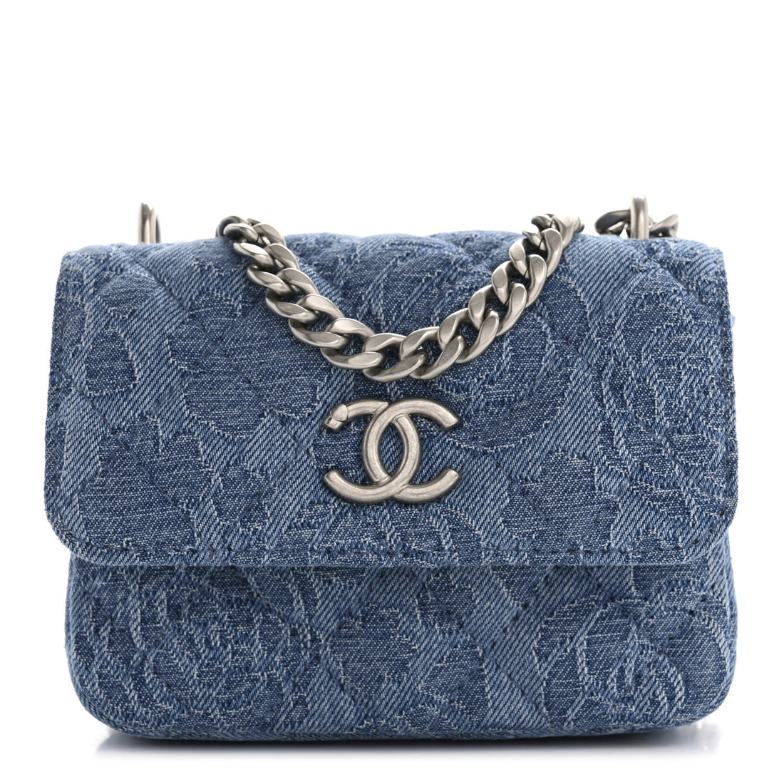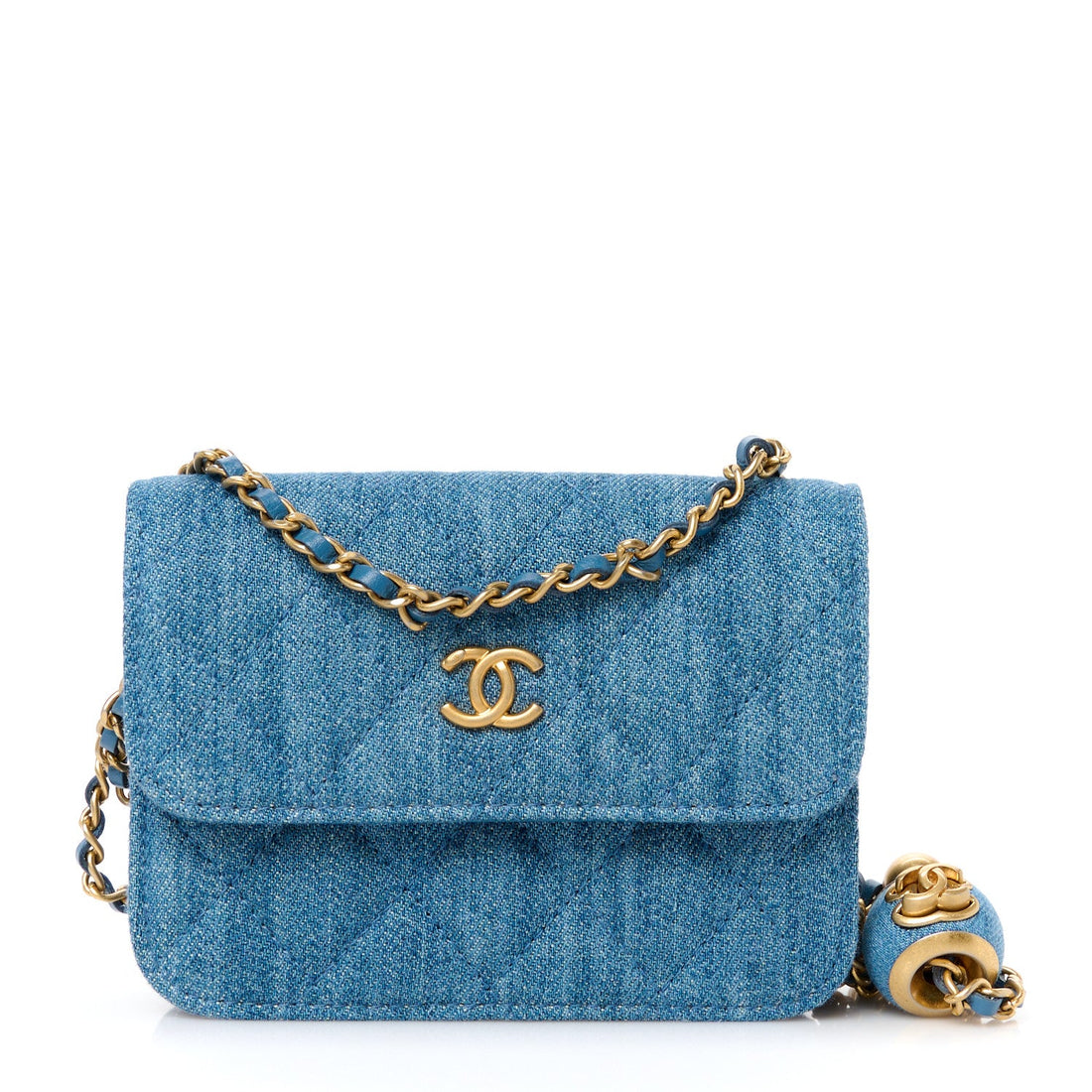 Denim Quilted CC Pearl Crush Clutch With Chain Blue