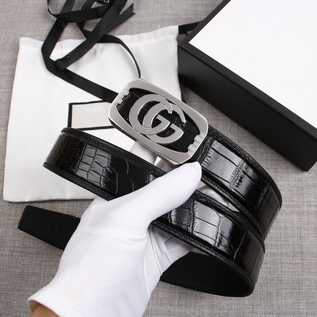G BELT SILVER SQUARE INSTALL BUCKLE BLACK LEATHER 4.0CM