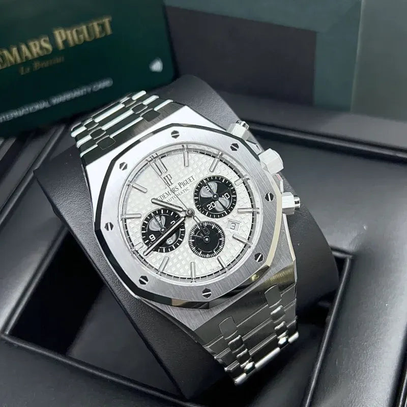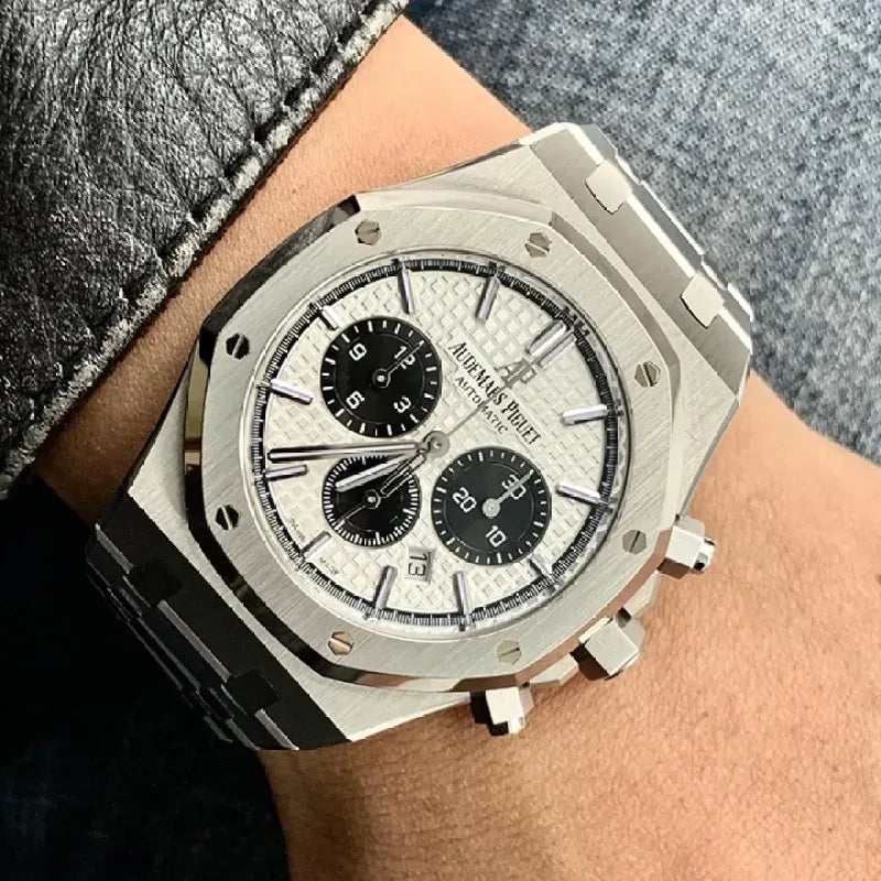 Silver-toned dial with “Grande Tapisserie” pattern, black counters and extern zone, white gold applied hour-markers and Royal Oak hands with luminescent coating.