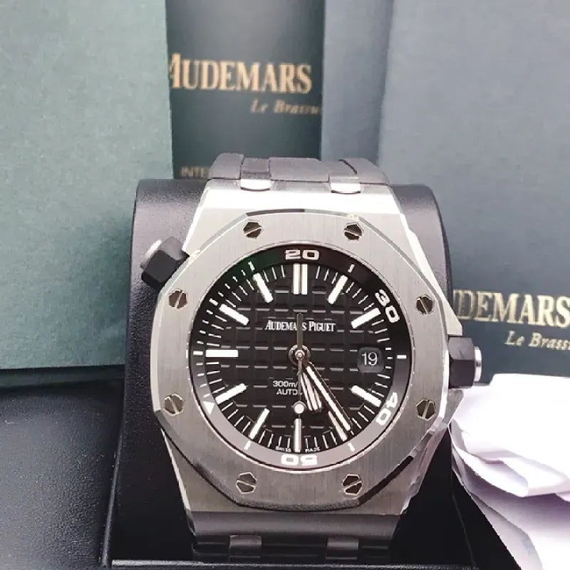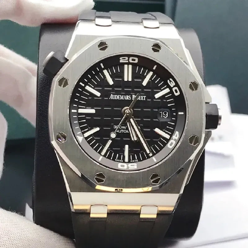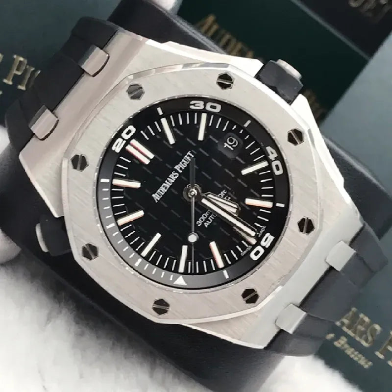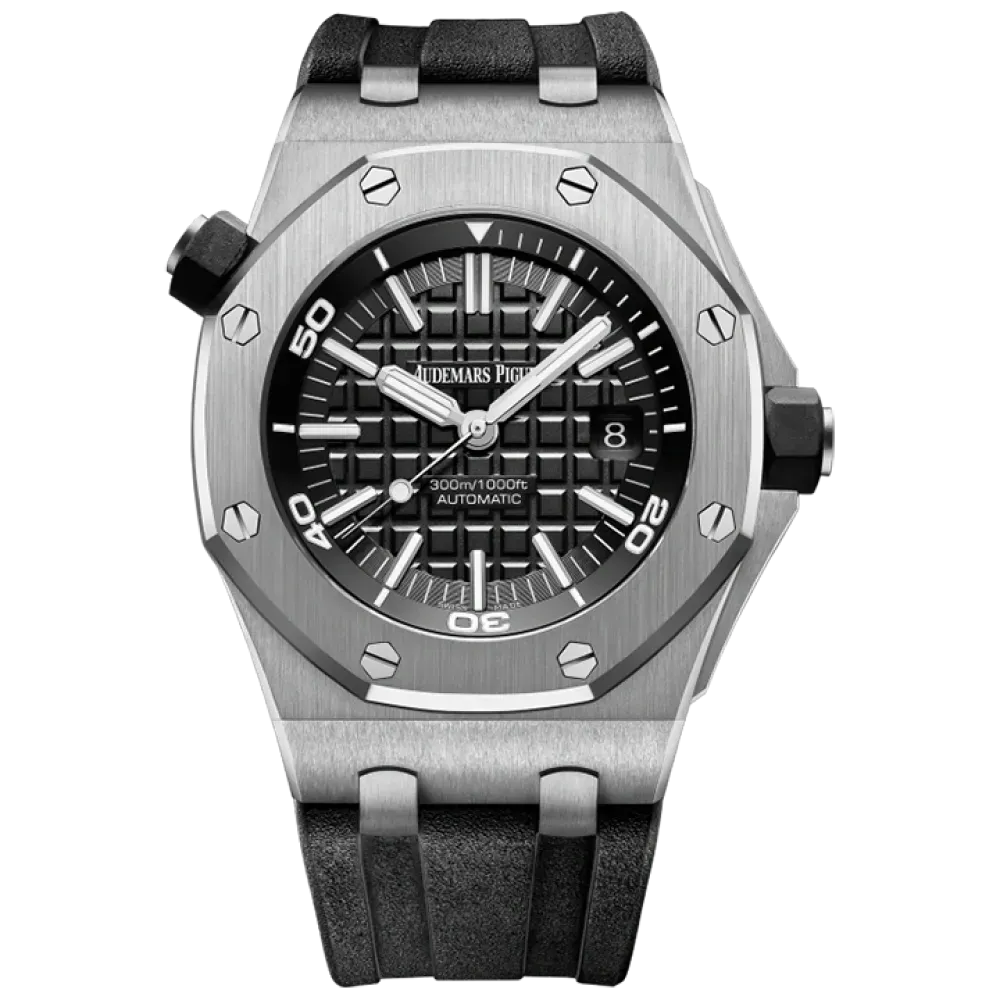Black dial with “Méga Tapisserie” pattern, white gold applied hour-markers and Royal Oak hands with luminescent coating (black minutes hand), black or silver-toned rotating inner bezel with diving scale and zone from 60 to 15 minutes in black.