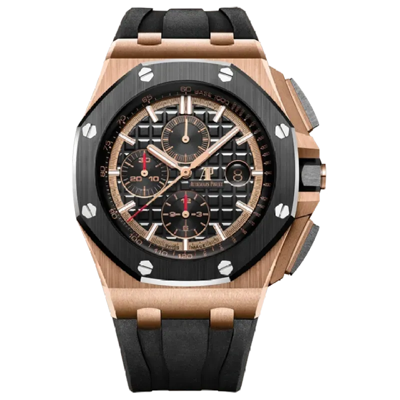 18-carat pink gold case, glareproofed sapphire crystal and caseback, black ceramic bezel, pushpieces and screw-locked crown, pink gold pushpiece guards.