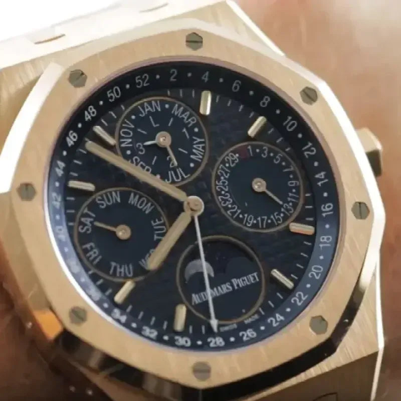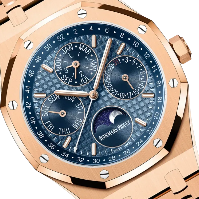 blue sub-dial with rose gold luminescent applied hour-markers and Royal Oak hands, blue inner bezel