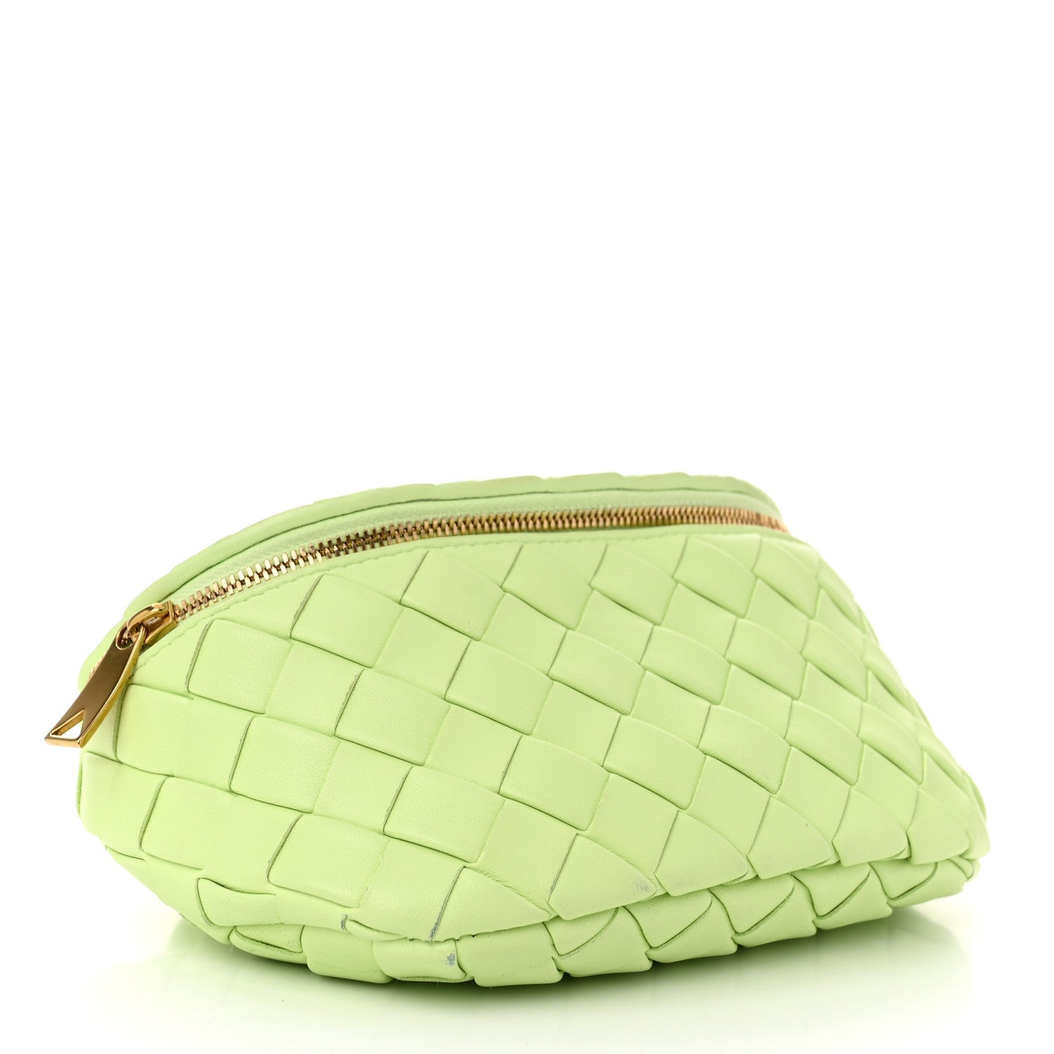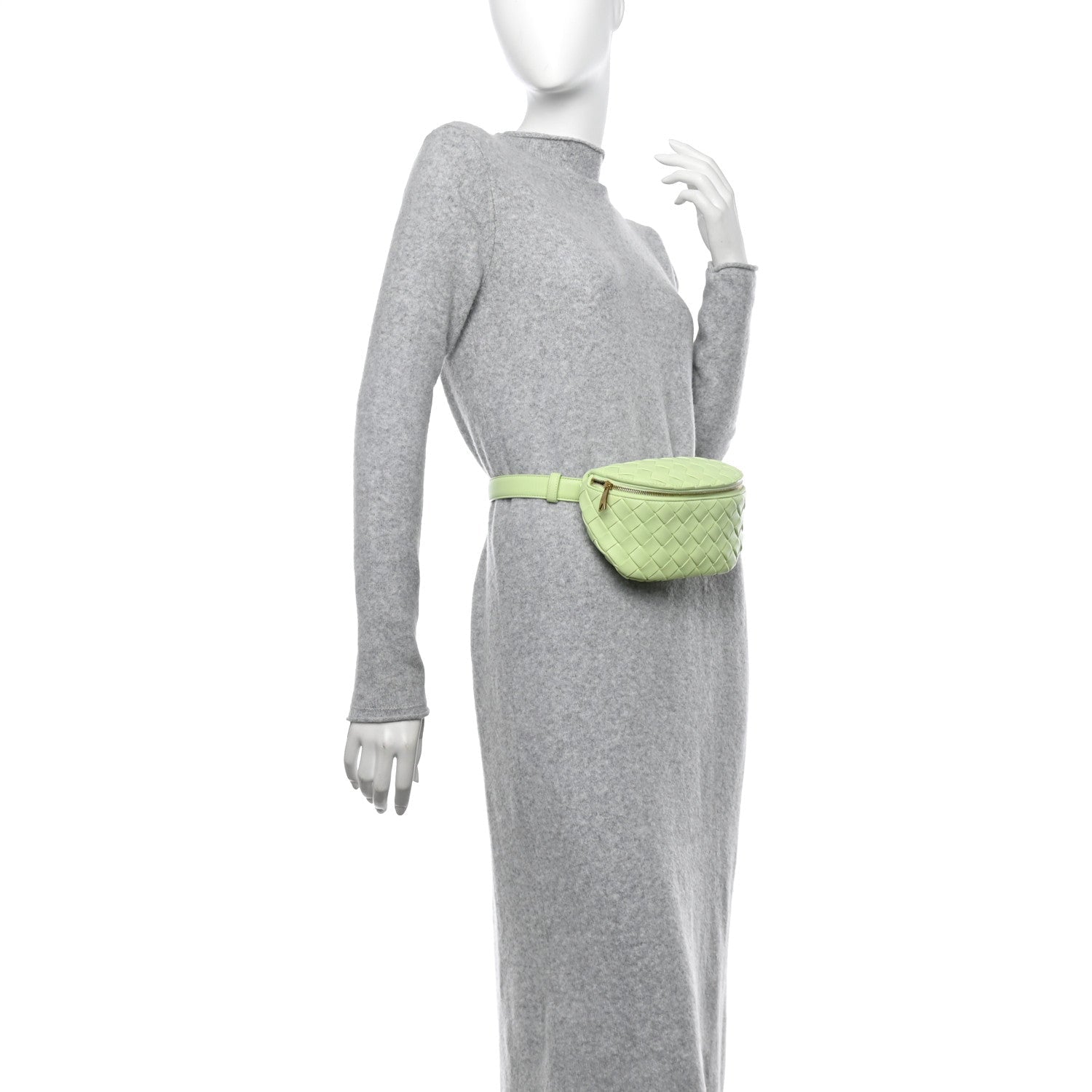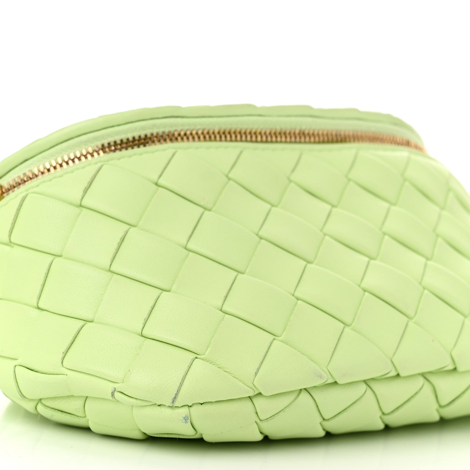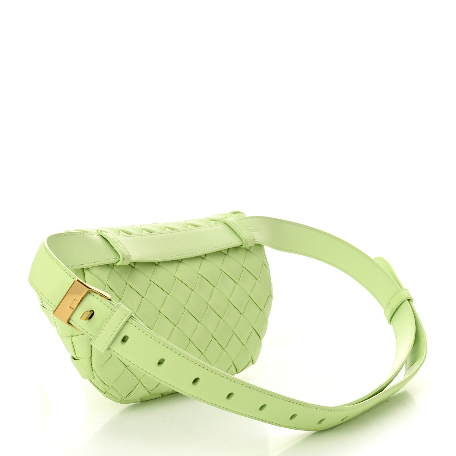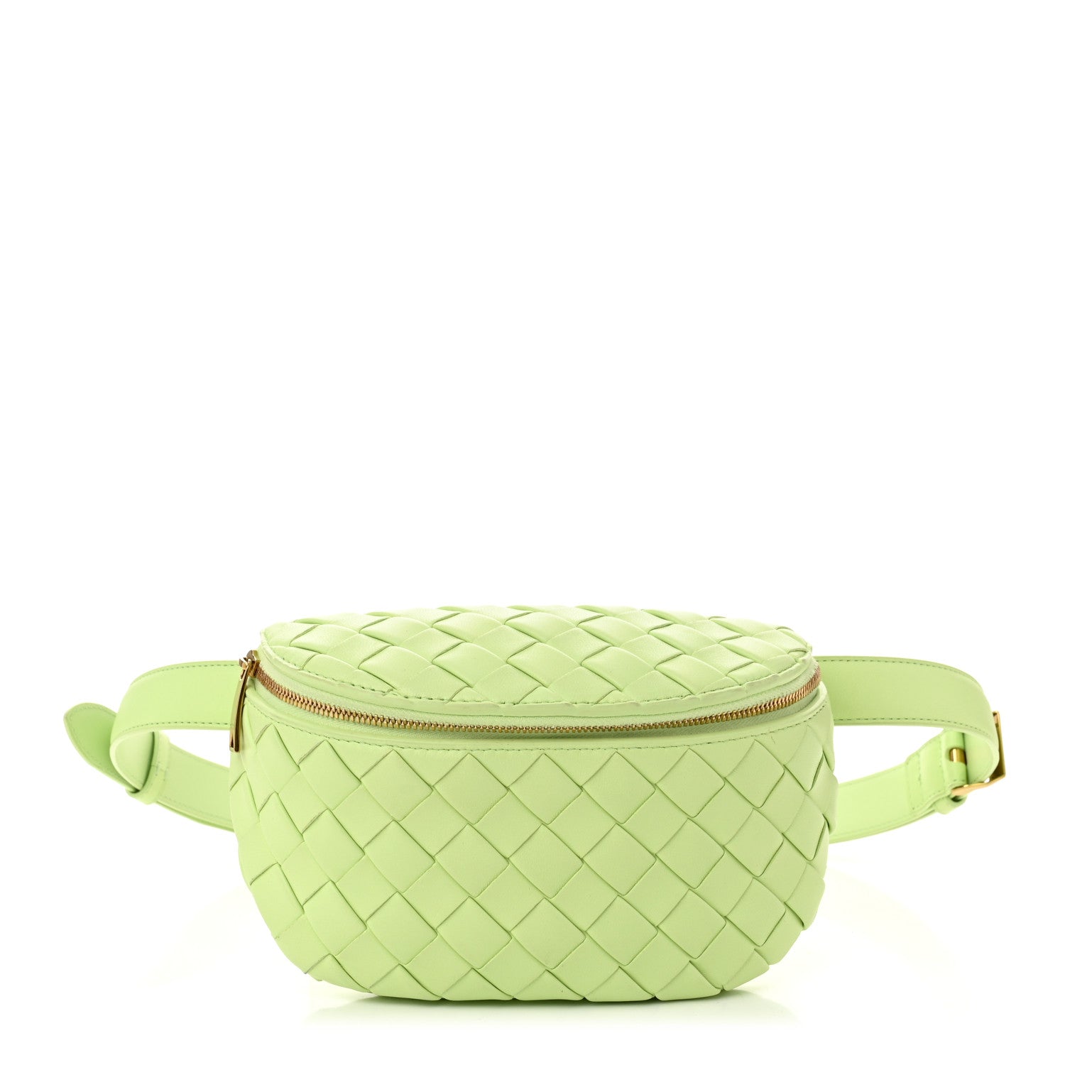 Expertly crafted with premium materials and designer-inspired detailing BOTTEGA VENETA Nappa Intrecciato Belt Bag in Fennel. This stylish belt bag is crafted of soft nappa lambskin intrecciato leather in light green. The bag features a green leather waist belt with an aged brass buckle and a top zipper. The top zipper opens to a matching leather interior with a key ring.