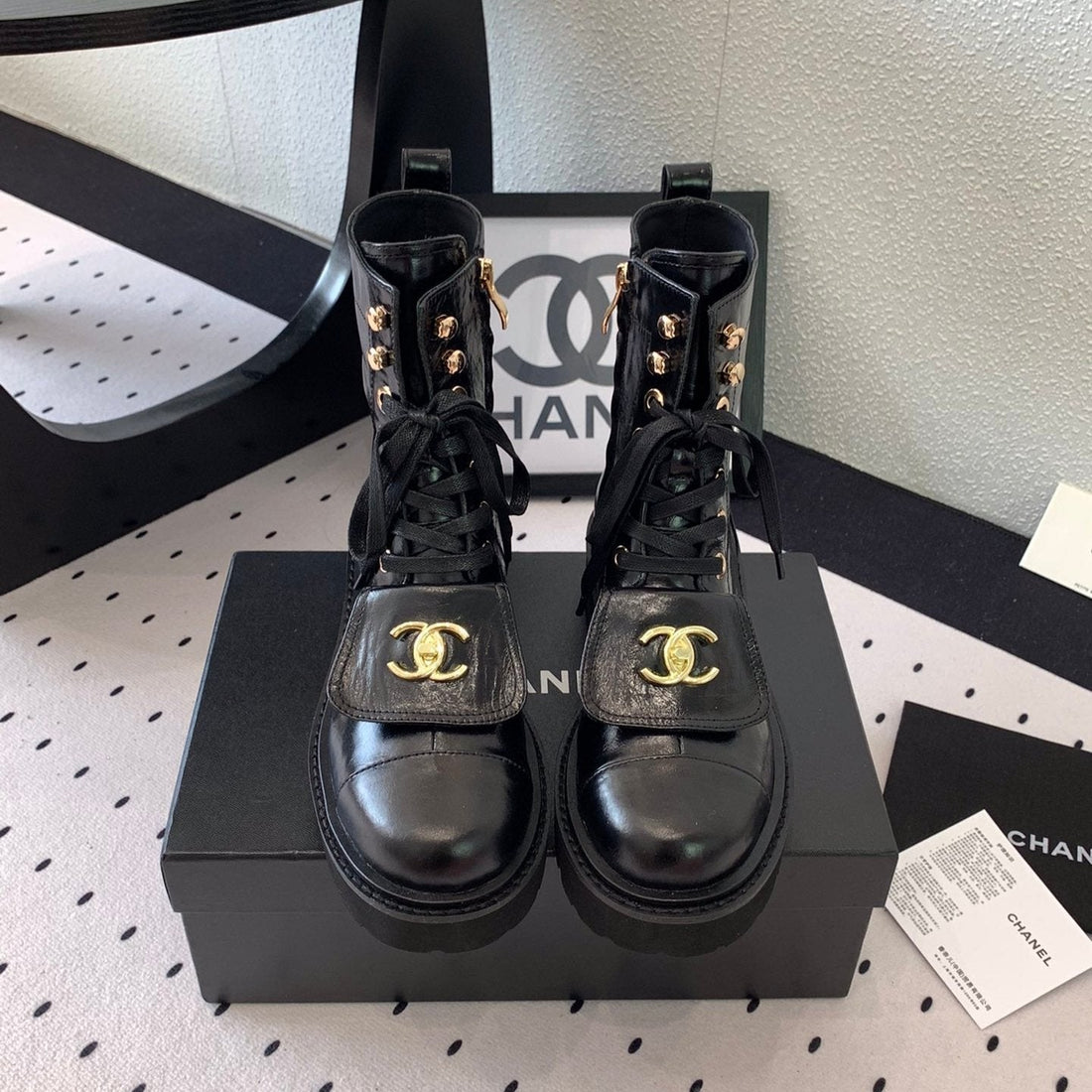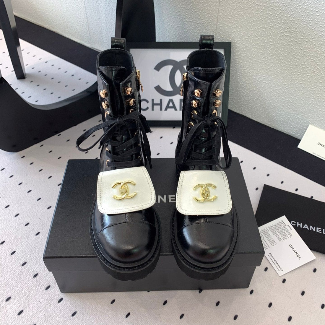 CC Short Boots In Black Mix White Logo Print Lambskin 938059