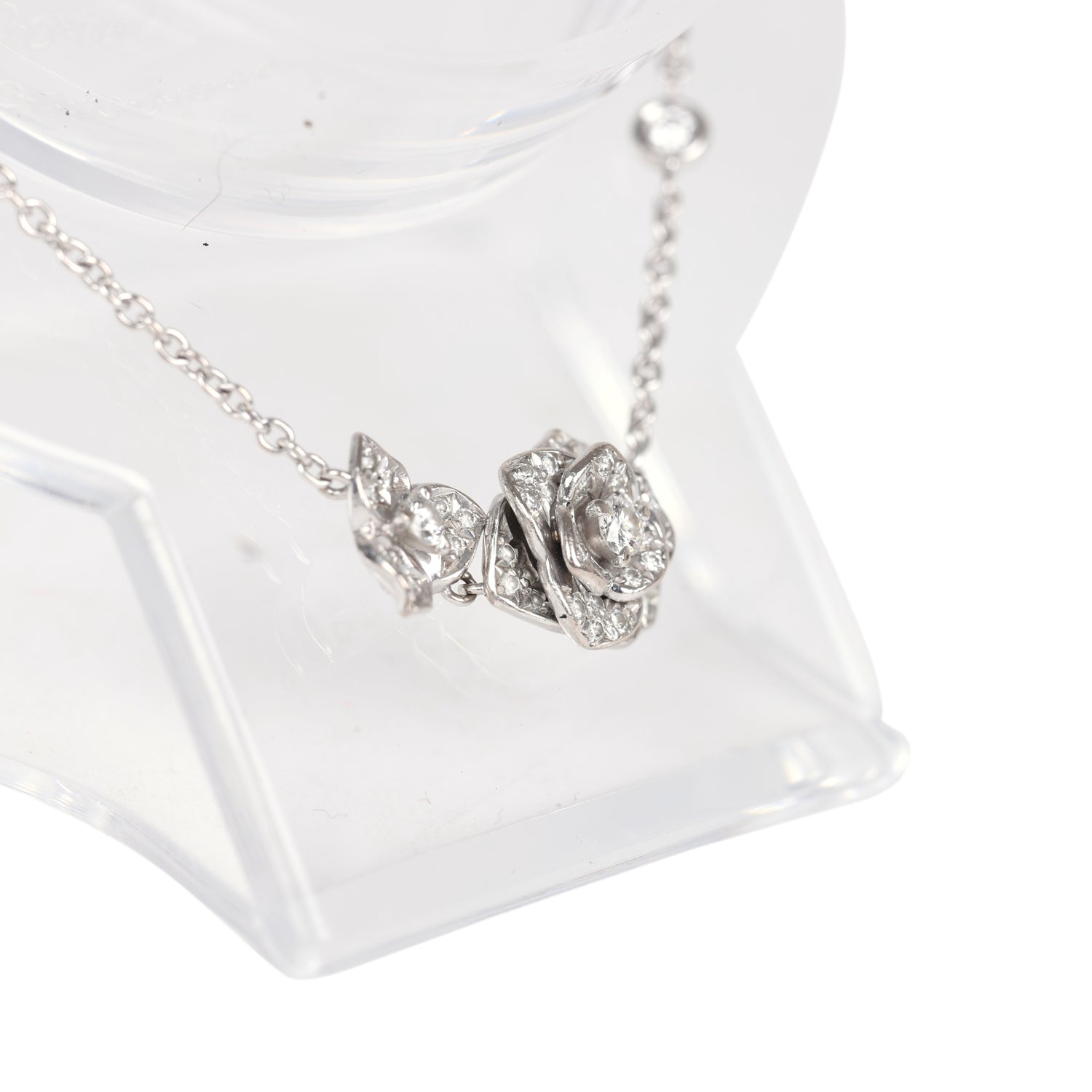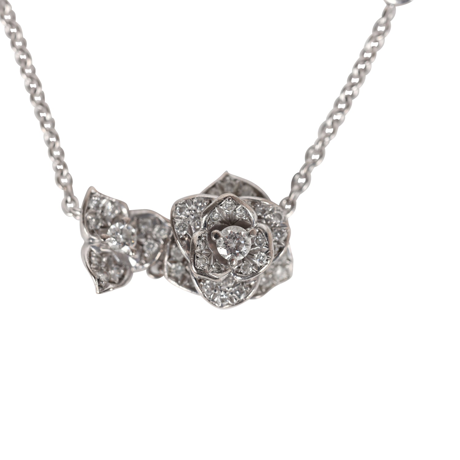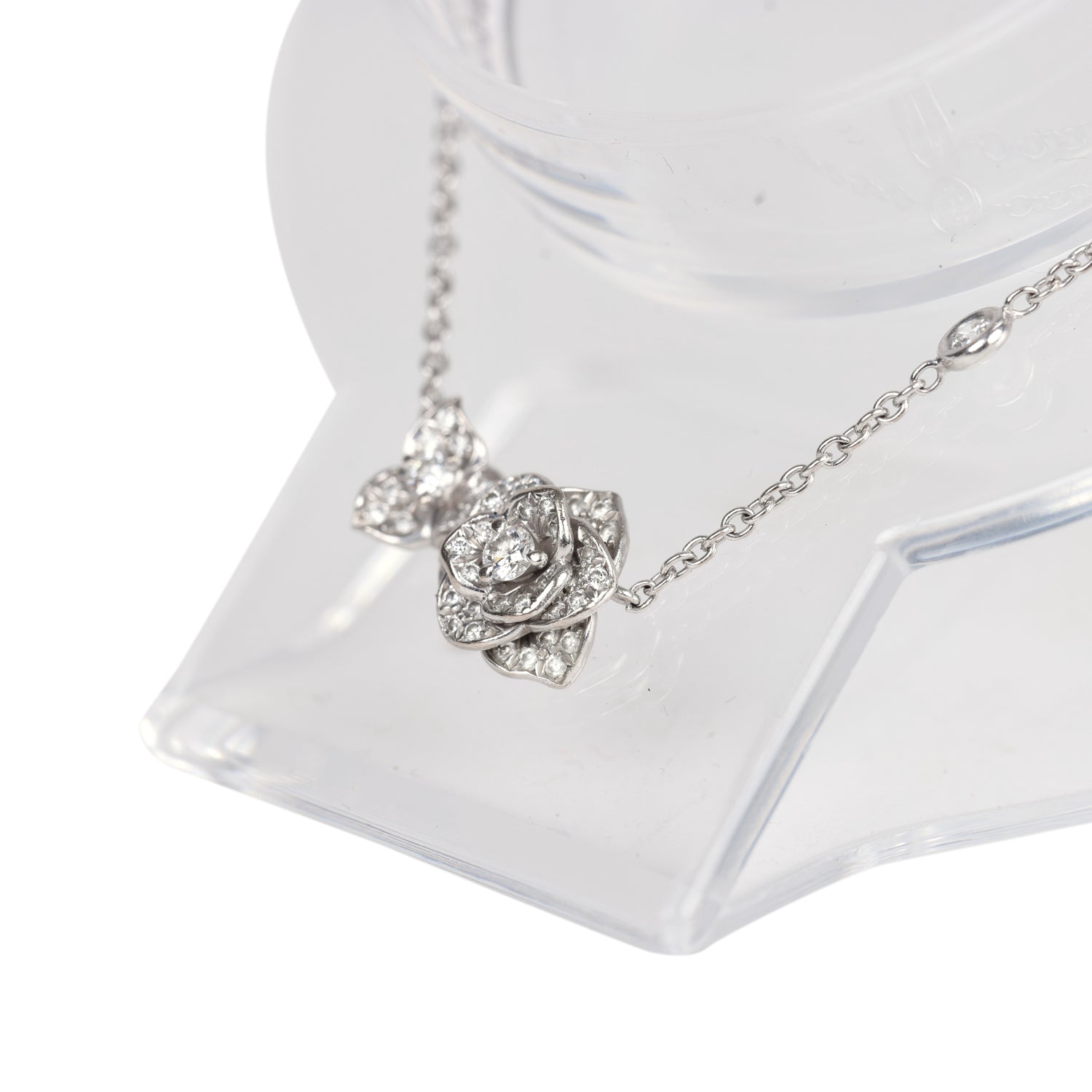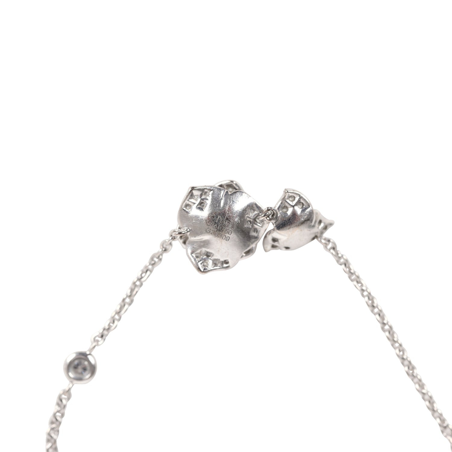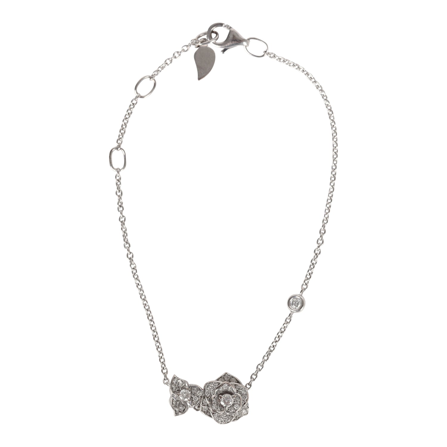 This Piaget bracelet is in 18K white gold chain with two diamond encrusted tiny roses and a lobster clasp closure.