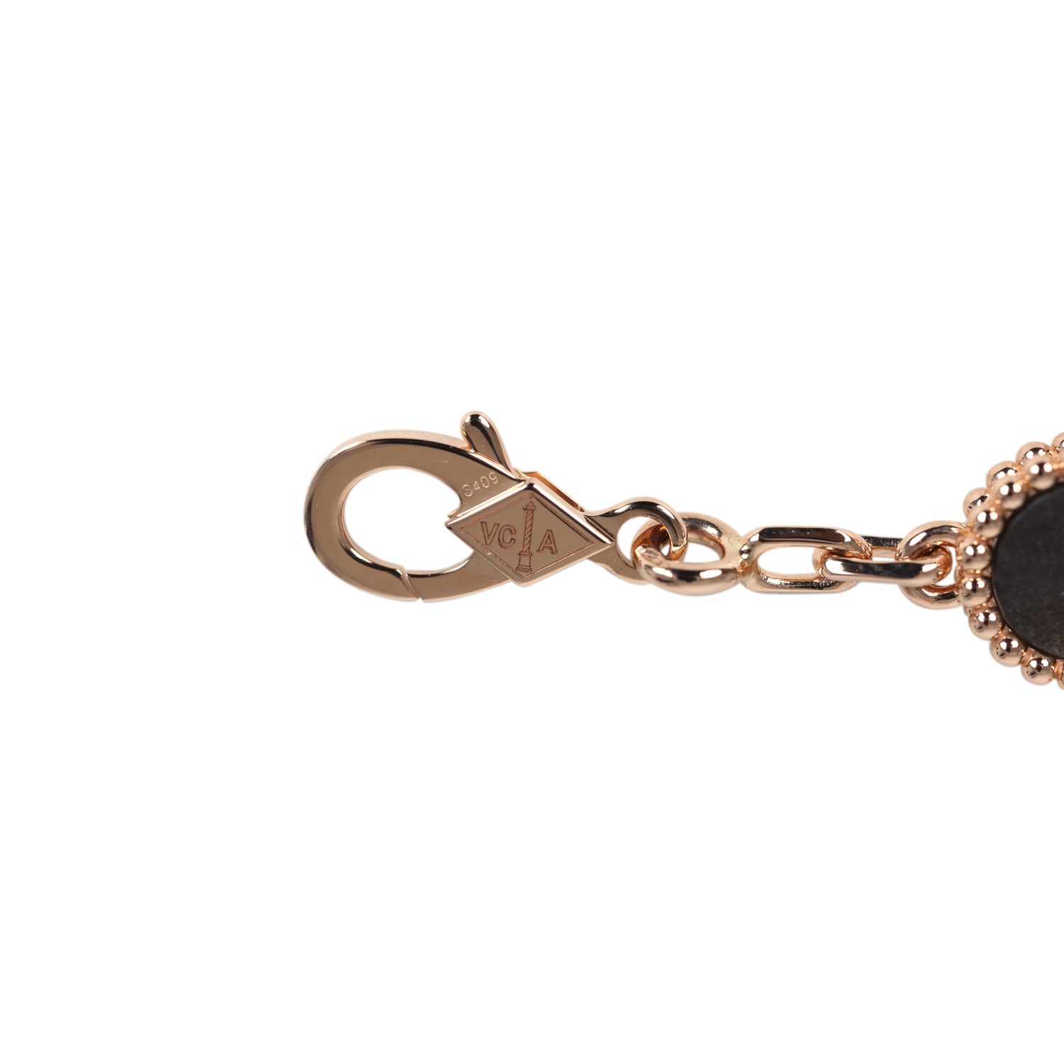This limited edition Van Cleef & Arpels Vintage Alhambra 5 Motif Bracelet of Silver Obsidian is in 18K rosegold hardware, featuring five Silver Obsidian clover motifs and has a hallmark/lobster clasp closure.
