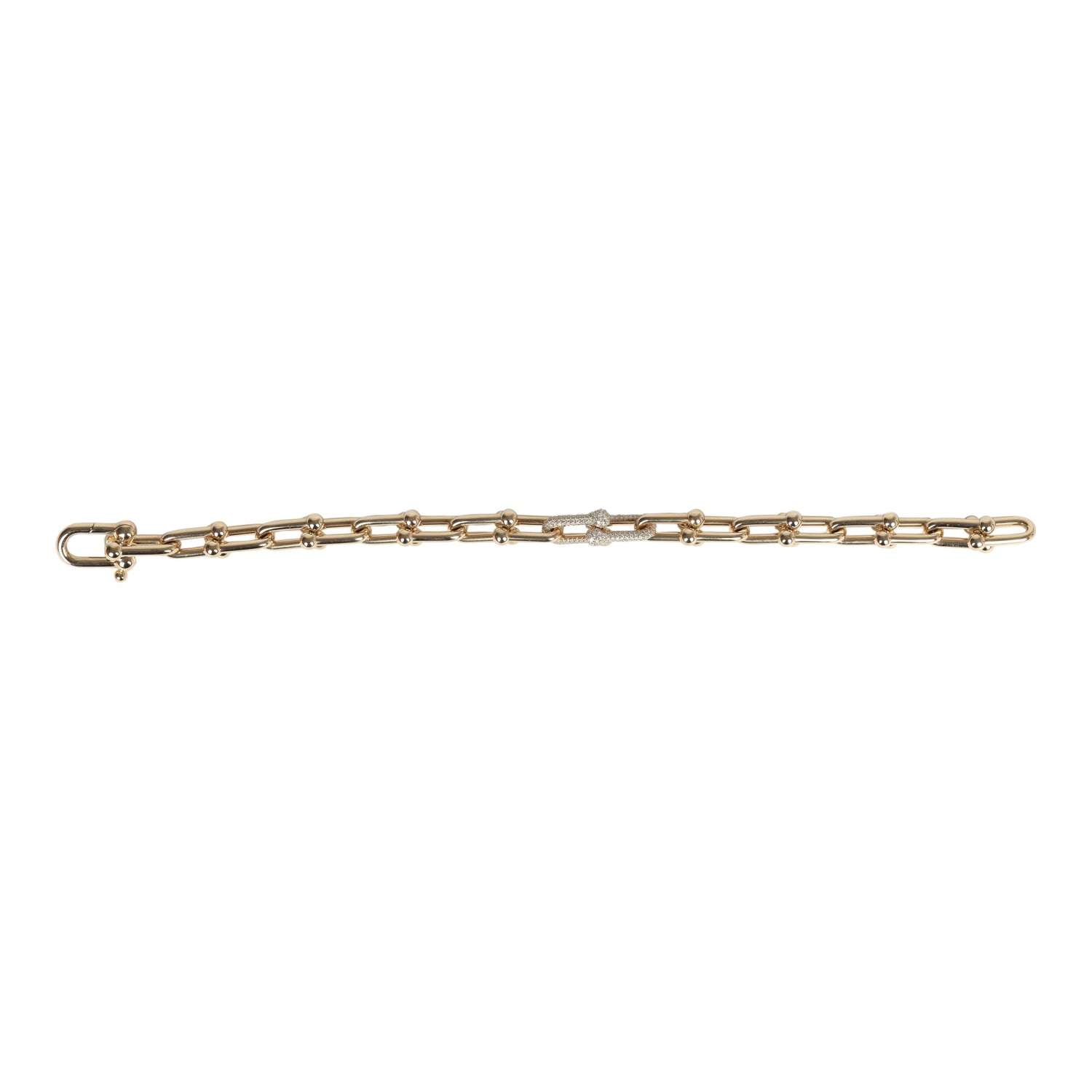 This Tiffany & Co Hardwear Medium Link Bracelet XL is in yellow gold hardware with diamonds, featuring medium sized links, two yellow gold links encrusted in 0.9 ct pavé diamonds, with a total carat weight of 1.39 and has a hook and clasp closure.