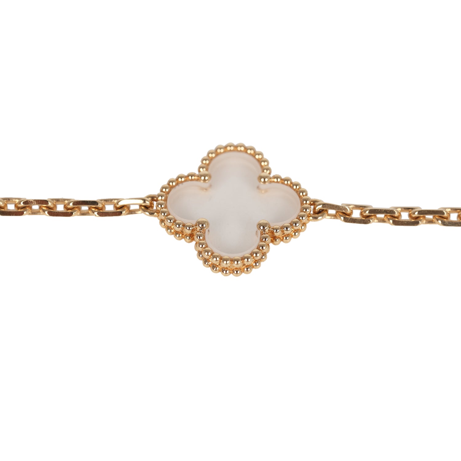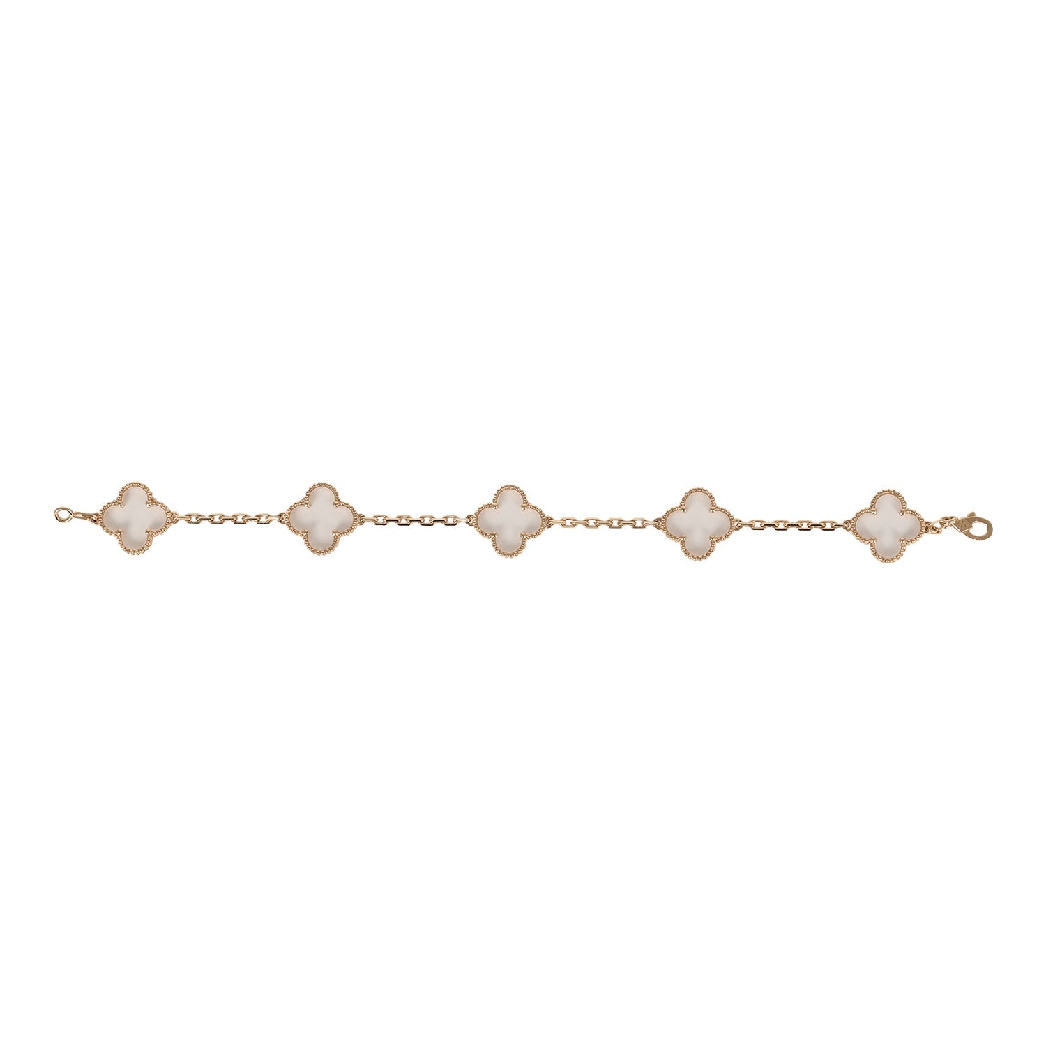 This Van Cleef & Arpels Vintage Alhambra Clear Rock Candy Crystal 5 Motif Bracelet in 18K yellow gold with five rock crystal clover motifs and has a hallmark lobster clasp closure.