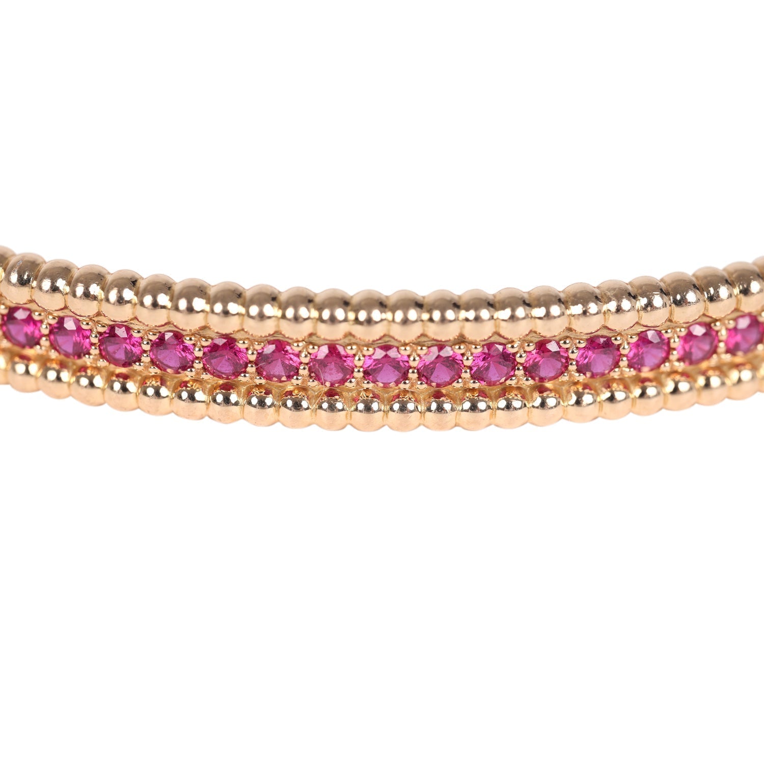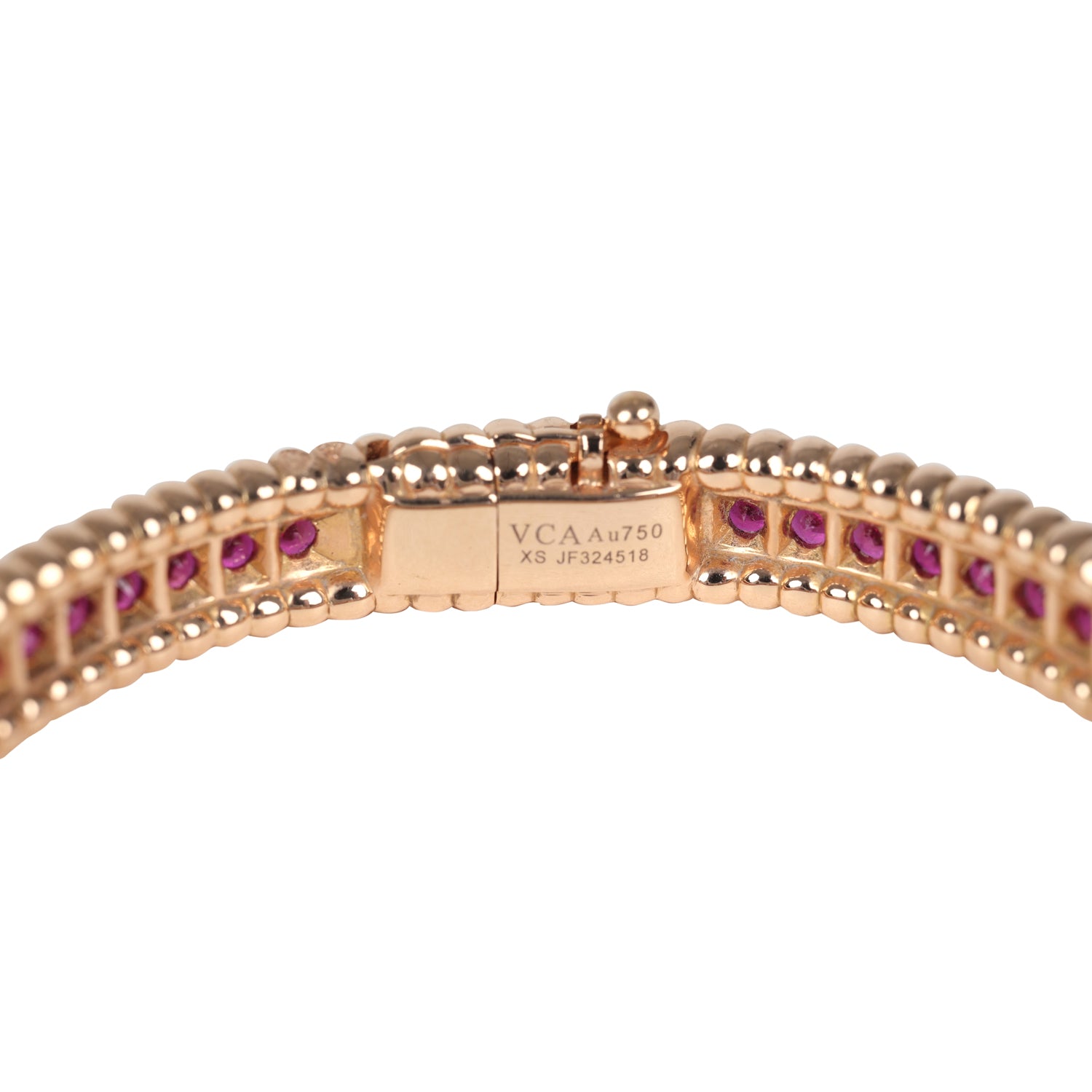 This Van Cleef & Arpels XSmall Perlee diamond bracelet is in 18K rose gold hardware and a total of 72 stones. It featuring a bangle bracelet with one row of ruby round cut diamonds and has a concealed box clasp closure.