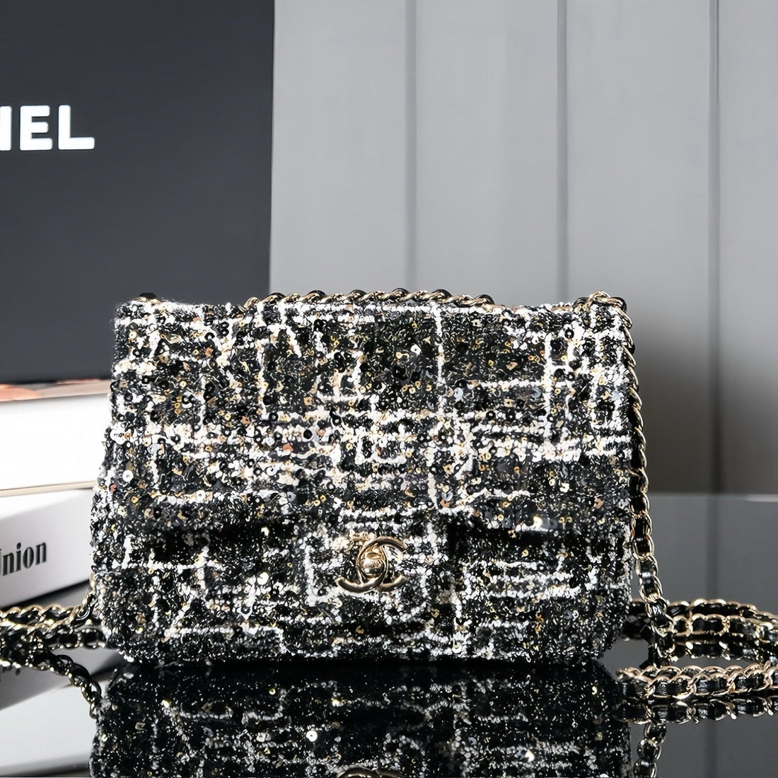 24S Flap Bag 20cm Black White Sequin Calfskin