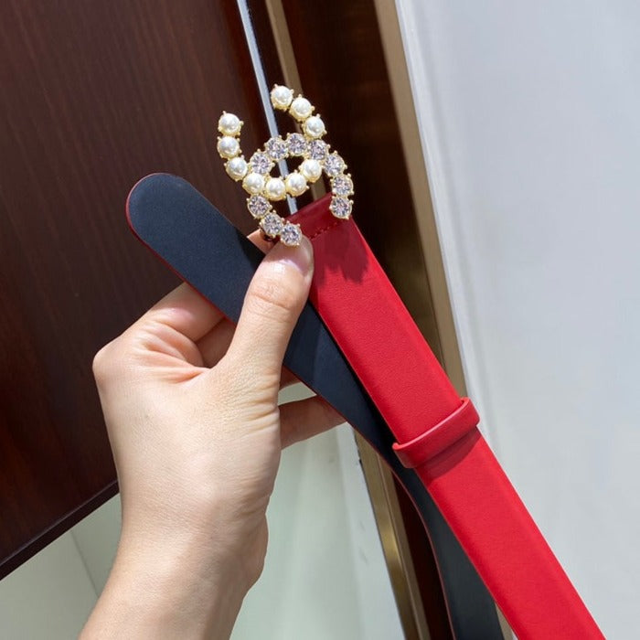 Cc Belt 3.0Cm Leather Red Buckle Gold Pearl Diamond