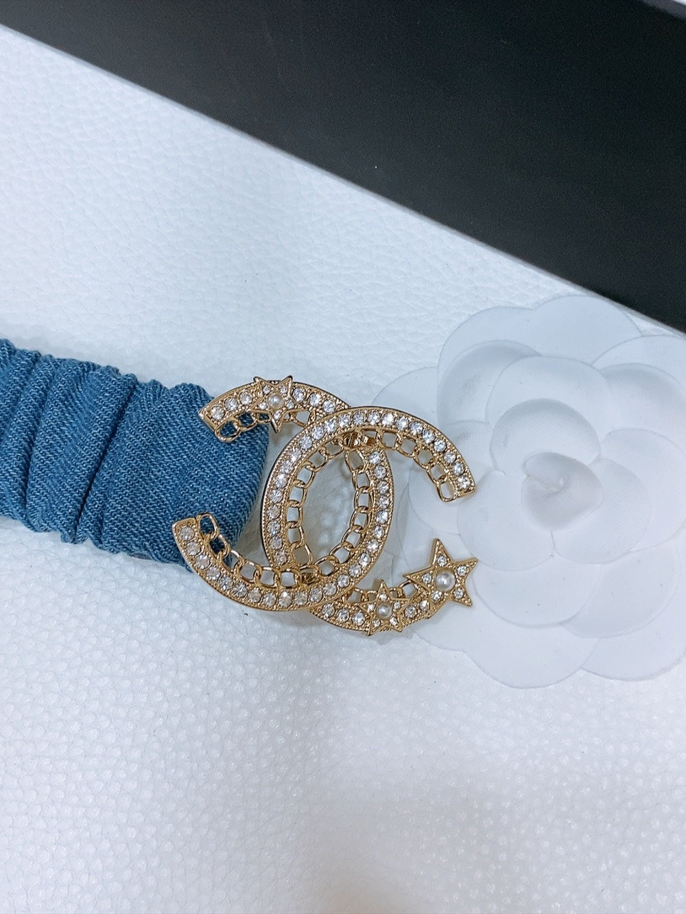Double C Elastic Belt 30Mm In Blue Denim Gold Crystal Star Embellished Buckle