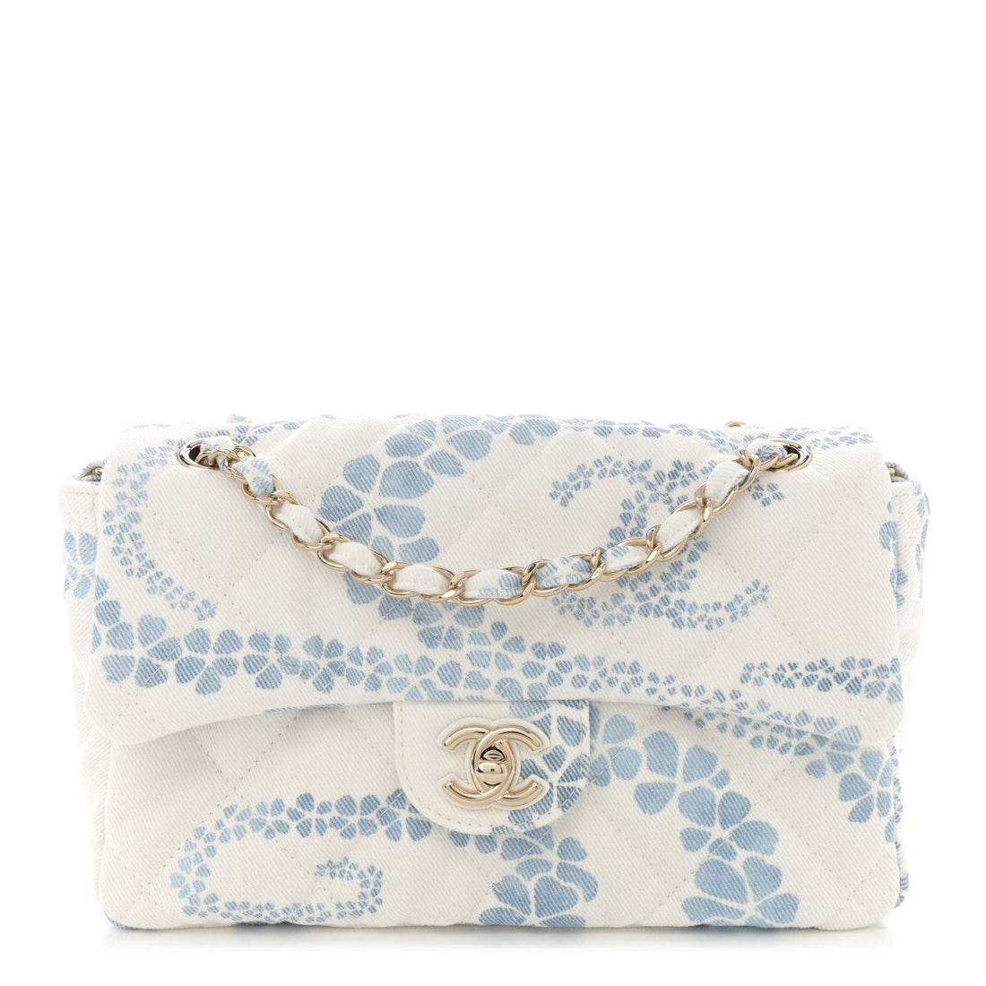 Printed Denim Quilted Mini Rectangular Flap Light Blue White