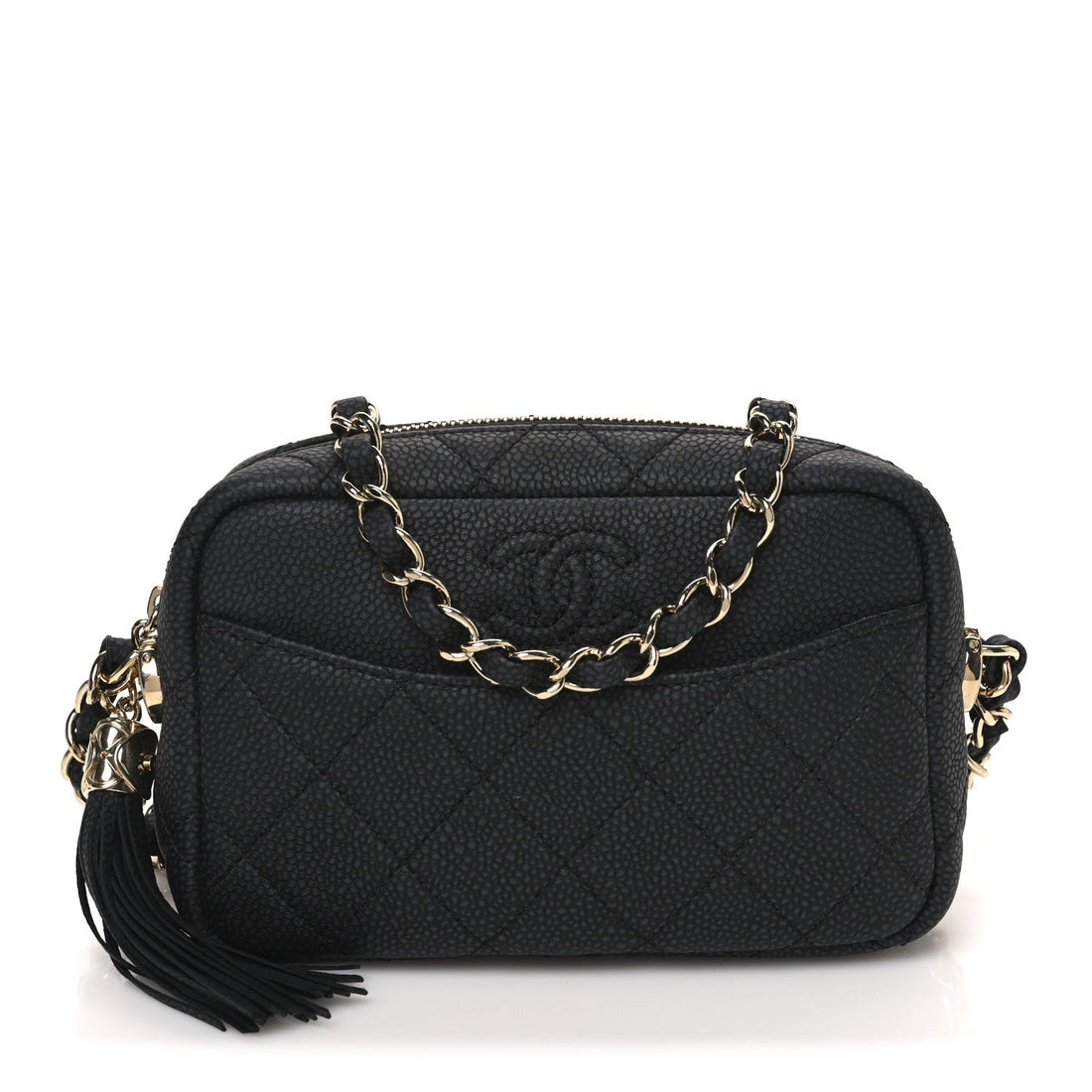 Iridescent Caviar Quilted Mini Coco Tassel Camera Case Black