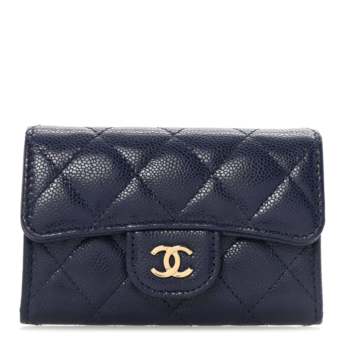 Caviar Quilted Flap Card Holder Wallet Navy Blue