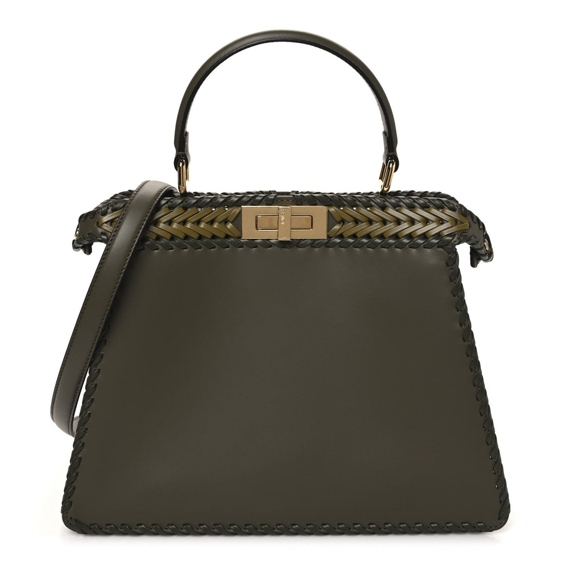 Vitello King Ceylon Shiny Nappa Woven Medium Peekaboo I SEE U Satchel Avocado Cedro Camaleonte