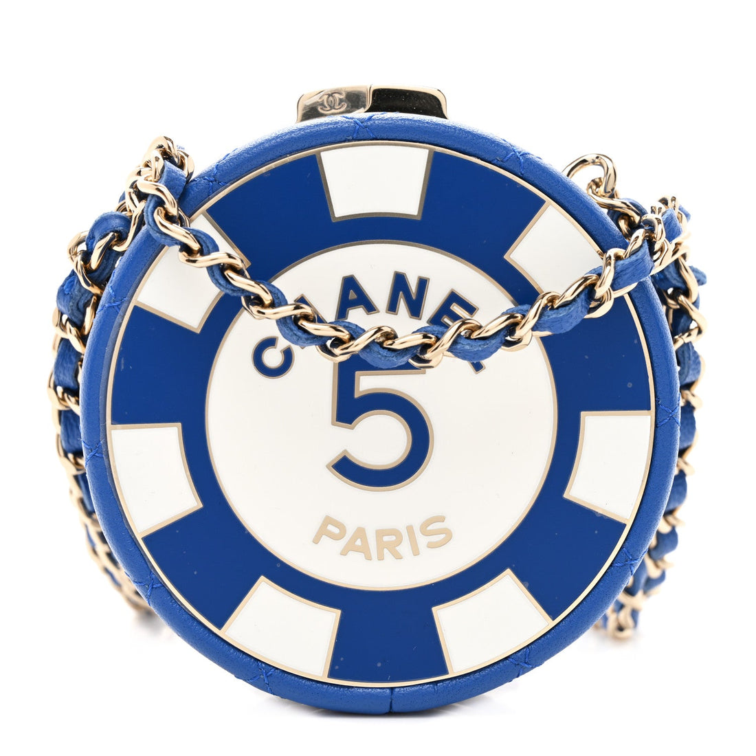 Lambskin Enamel Quilted Round Poker Chip Clutch With Chain Blue White