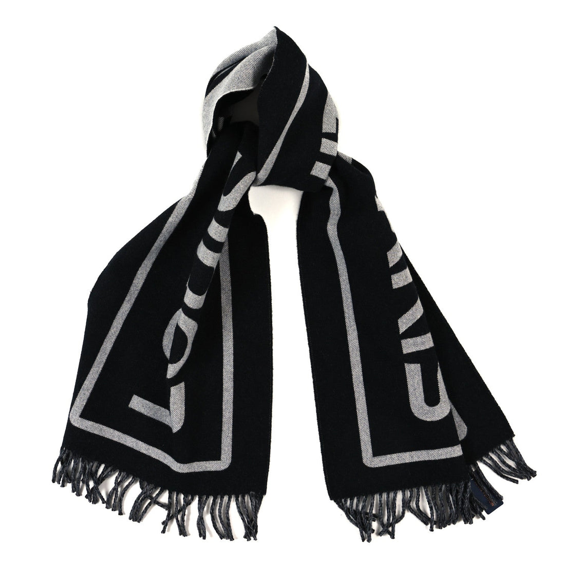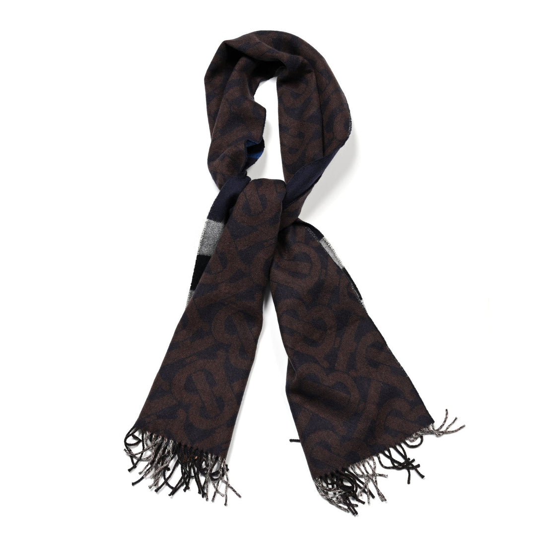 Cashmere Half Mega Check Monogram TB Reversible Fringe Scarf Dark Charcoal Blue