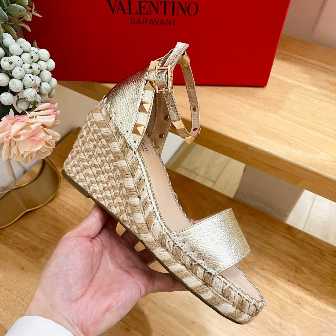 Double Rockstud Grainy Calfskin Wedge Sandal In Light Yellow Metallic Cowhide And Raffia 852839