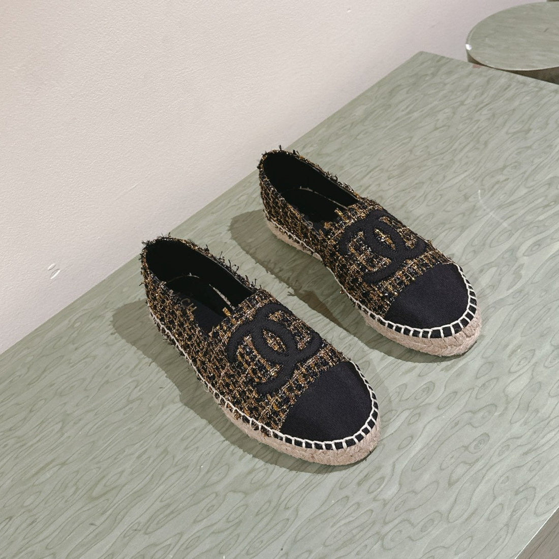 espadrilees black gold tweed canvas