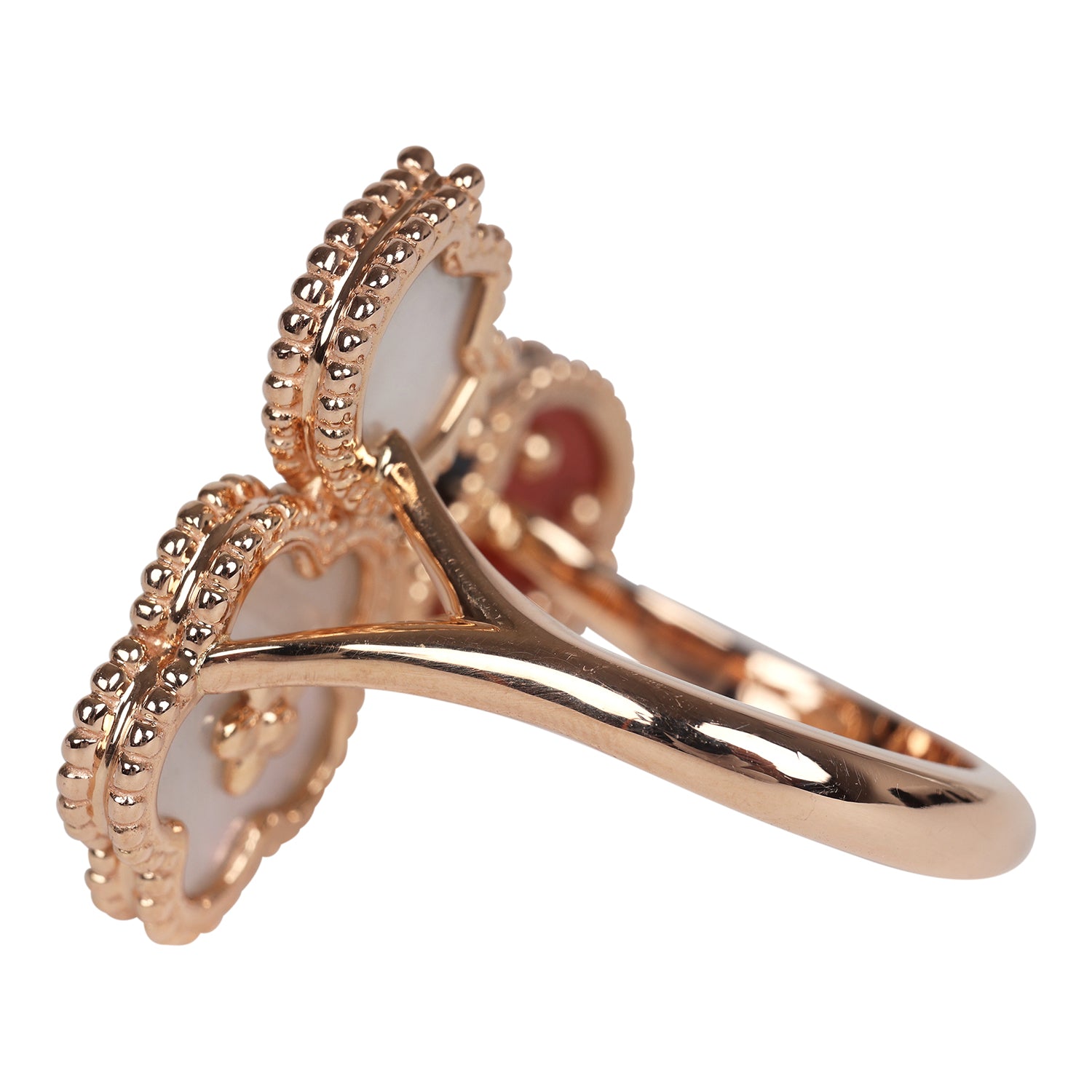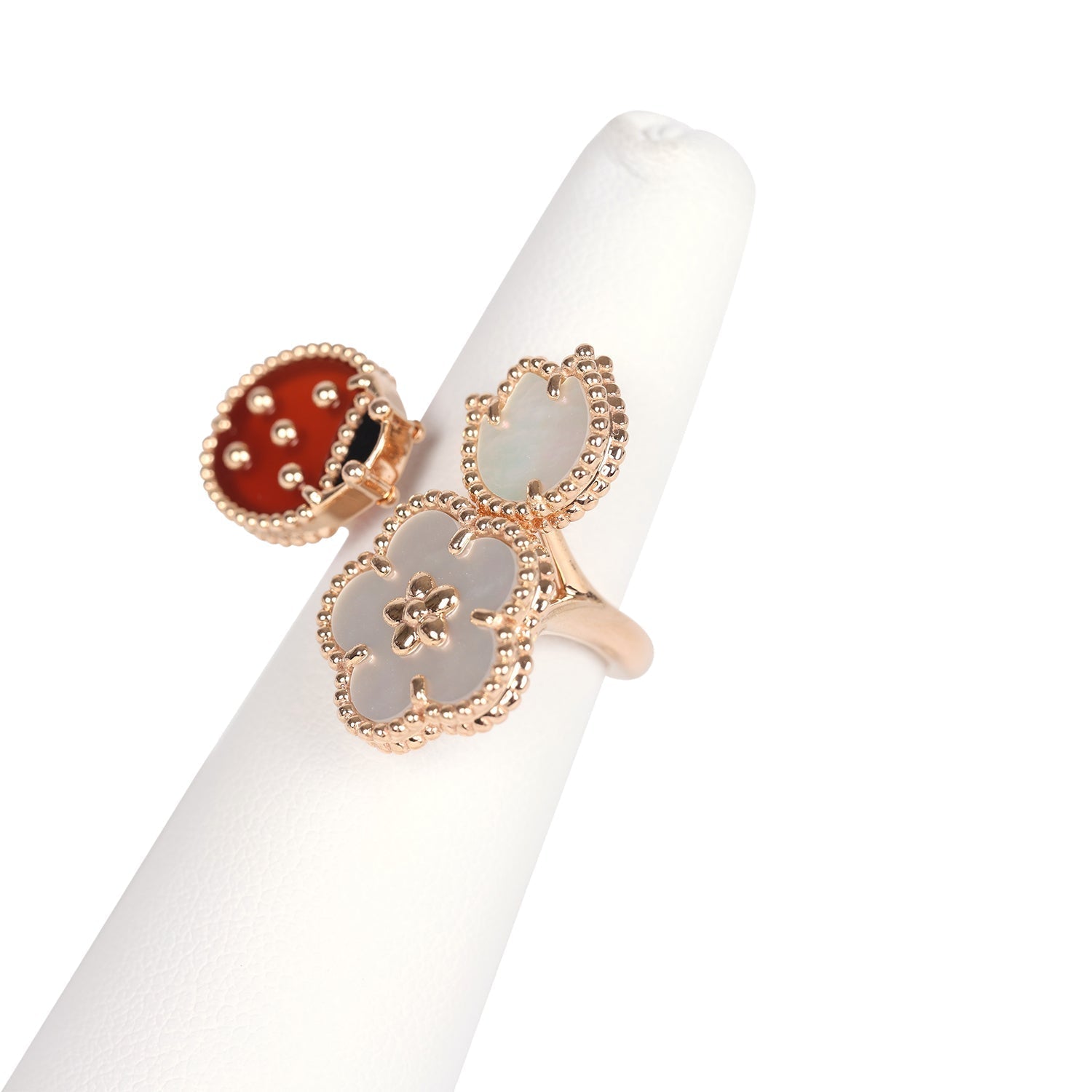 This Van Cleef & Arpels Lucky Spring Between the Finger Ring in Carnelian, Mother of Pearl and Onyx with 18K rose gold hardware, featuring a Carnelian and Onyx ladybug motif and one mother of pearl rose and one classic mother-of-pearl clover motif.