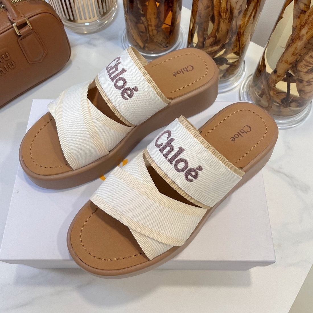 CHLOE WOODY WEDGE SANDALS IN WHITE CANVAS WITH CIDER BROWN RUBBER SOLE