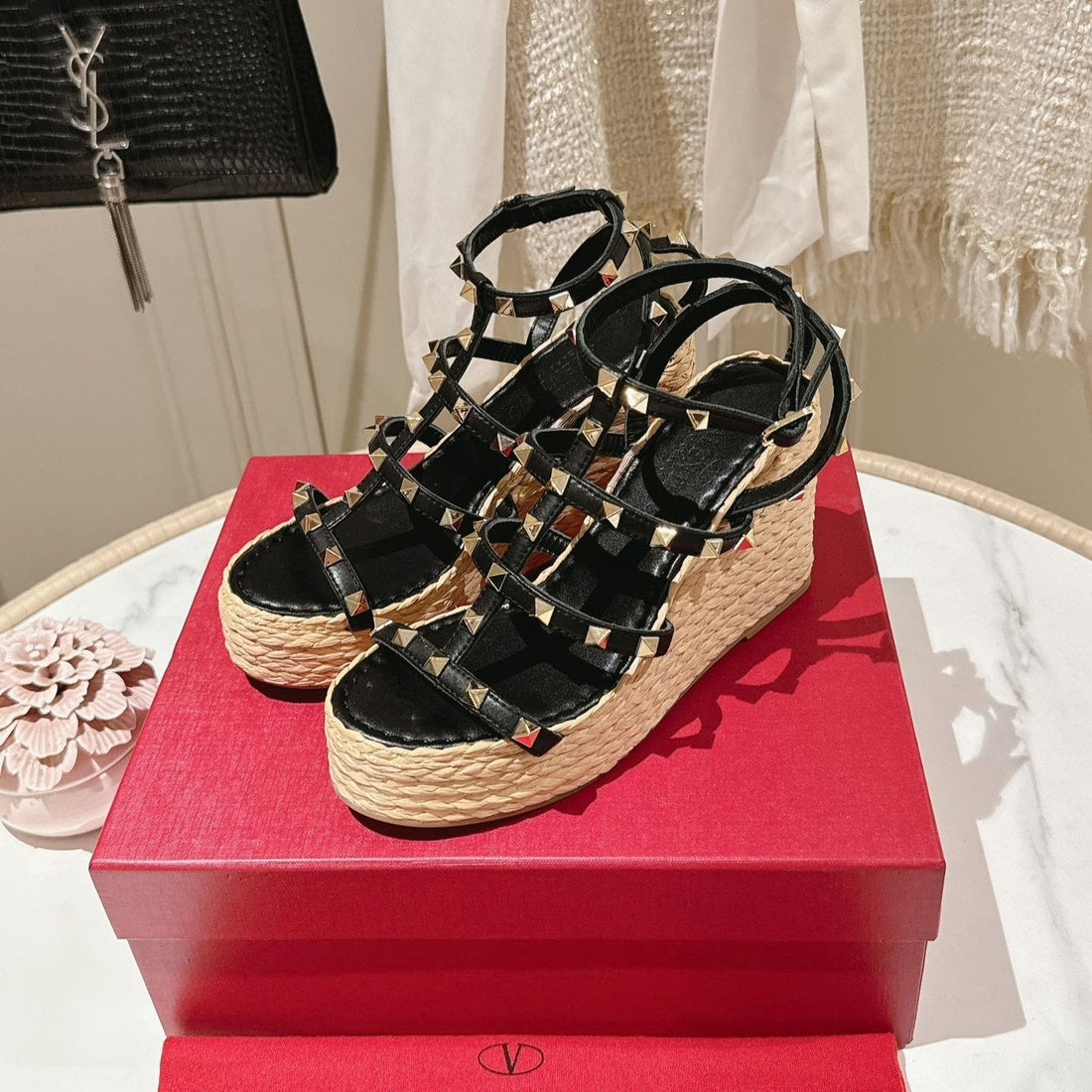 GARAVANI ROCKSTUD WEDGE SANDALS IN BLACK CALFSKIN AND BEIGE RAFFIA