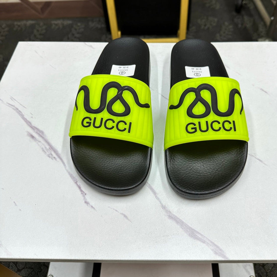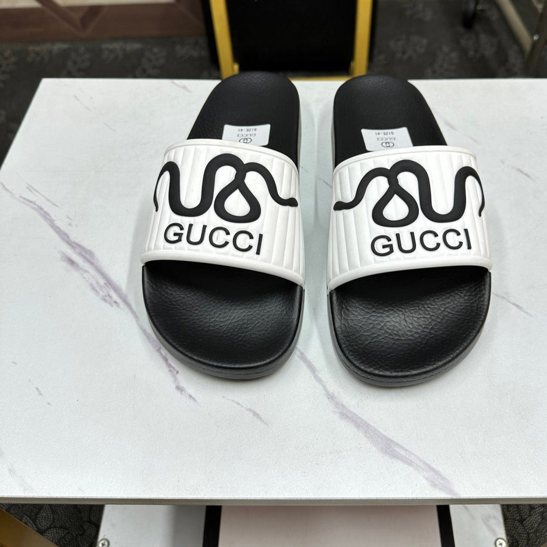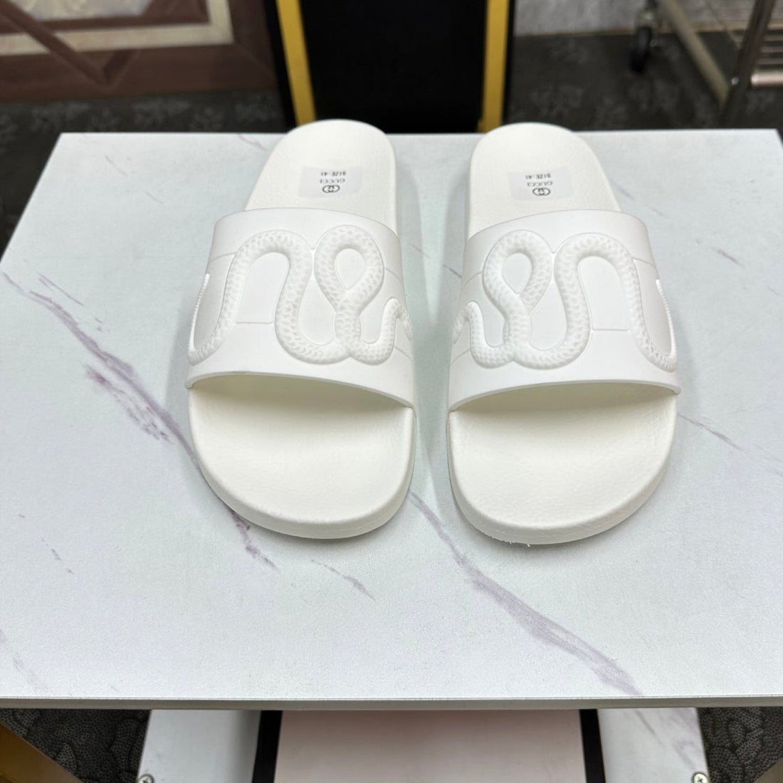 GG Men's Snake Embossed Slide White Black Rubber 540109