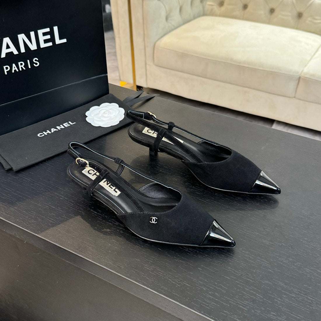 CC Slingback Flat Black Beige Lambskin