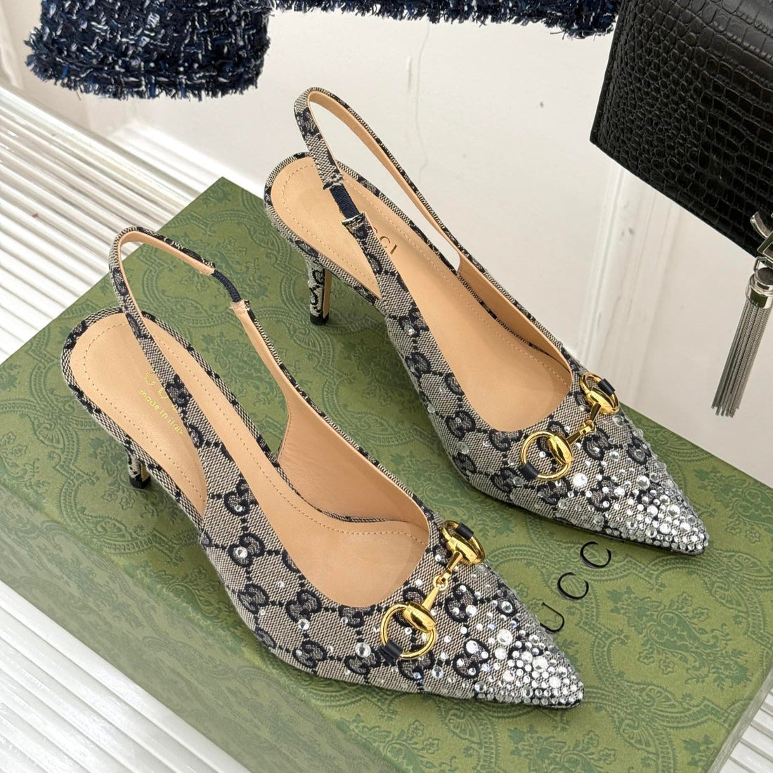 GG Horsebit Slingback 85MM Beige Black Monogram Canvas Point Toe Crystal-Embellished
