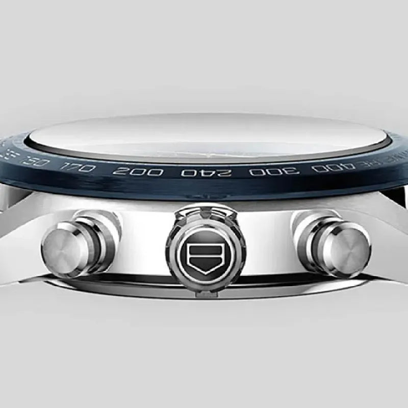 An elegant ceramic blue tachymeter fixed bezel, steel screw-down sapphire case back and pressure resistance to 100m, this watch stands up to anyone and anything.