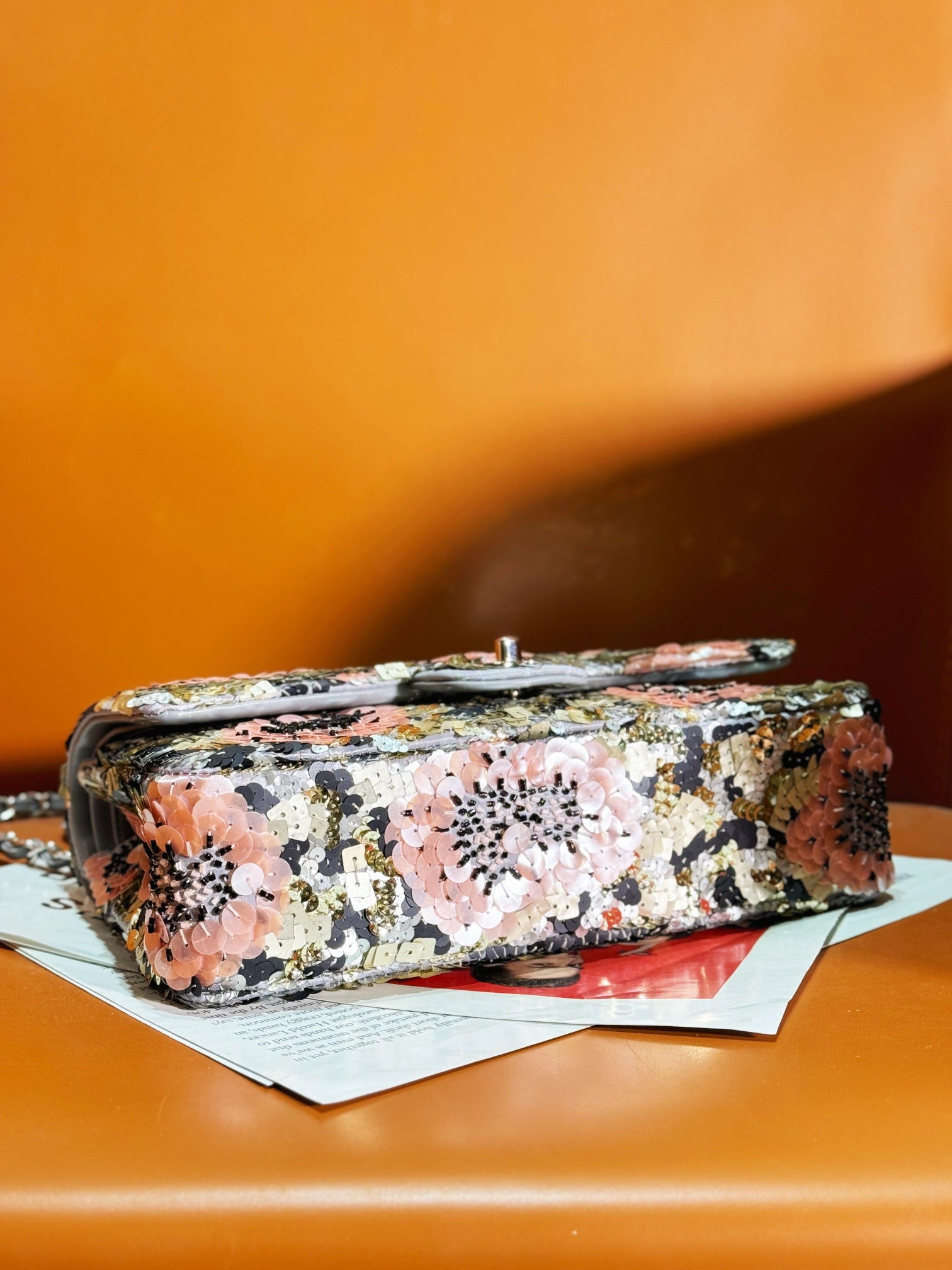 24S Flap Bag 25.5cm Multicolor Sequin Pink Flower Pearl Caflskin
