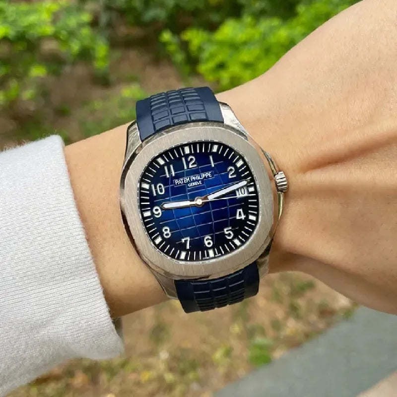 Paying tribute to the 20th anniversary of the Aquanaut launched in 1997, the men’s model is now available in the new 42.2-millimeter “Jumbo” format. It features an embossed dial subtly gradated from black to night blue. Decidedly masculine looks for this incarnation of casually elegant chic framed by a delicately satin-finished bezel. The white-gold case is water resistant to 120 m and protects the self-winding caliber 26‑330 S C movement.