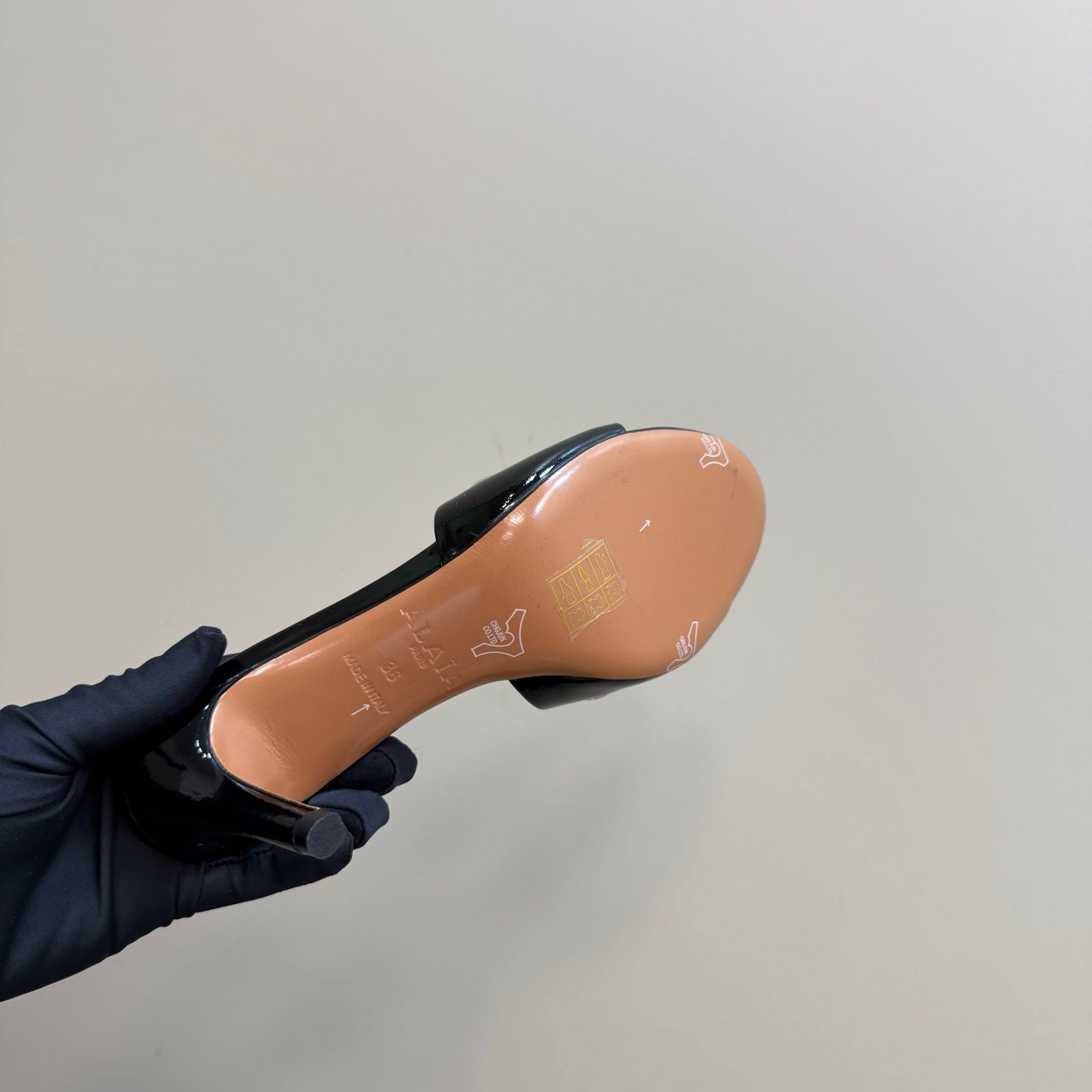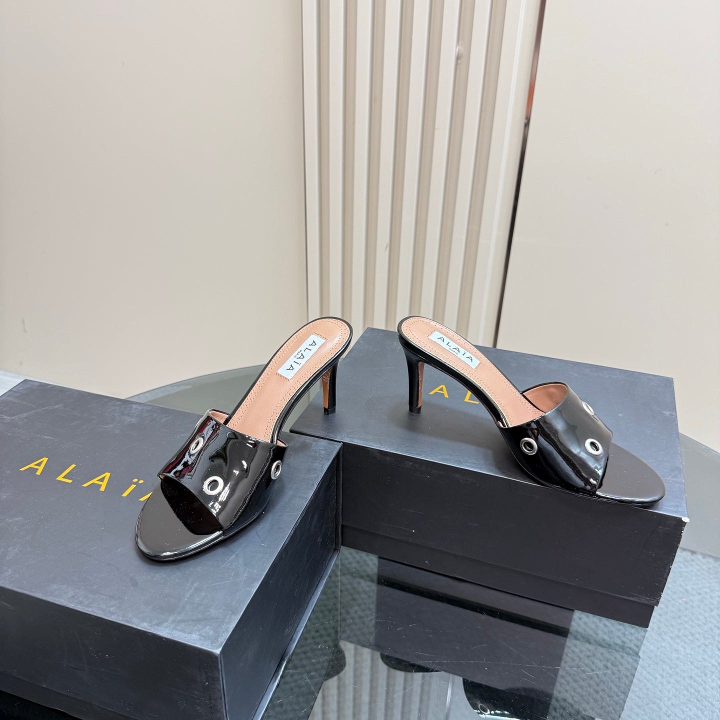 Alaia 2025 Oeillets Embellished Leather Sandals Glossy Black Lambskin 299668