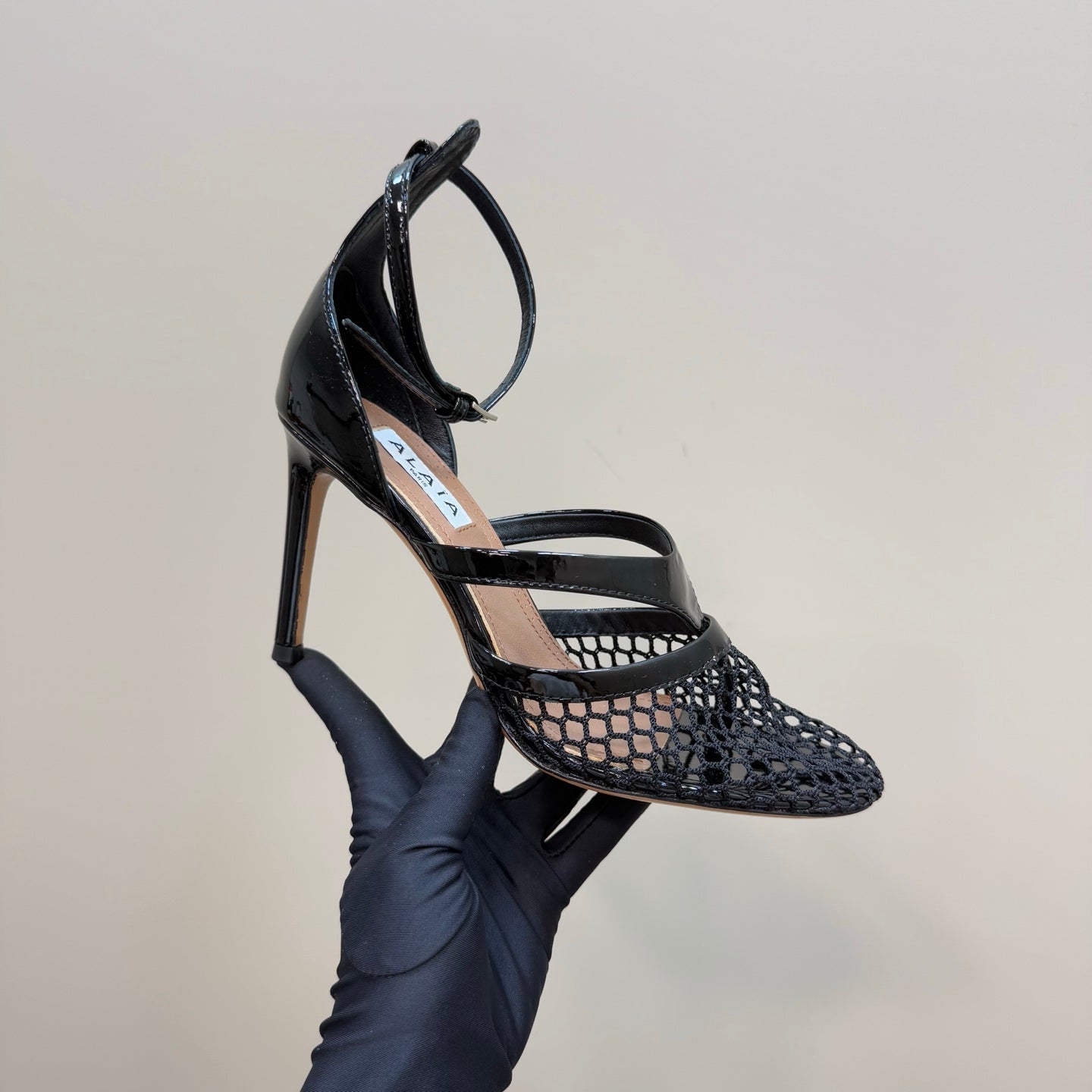 Alaia Fishnet Thong Heels Sandals Black Lambskin 299658