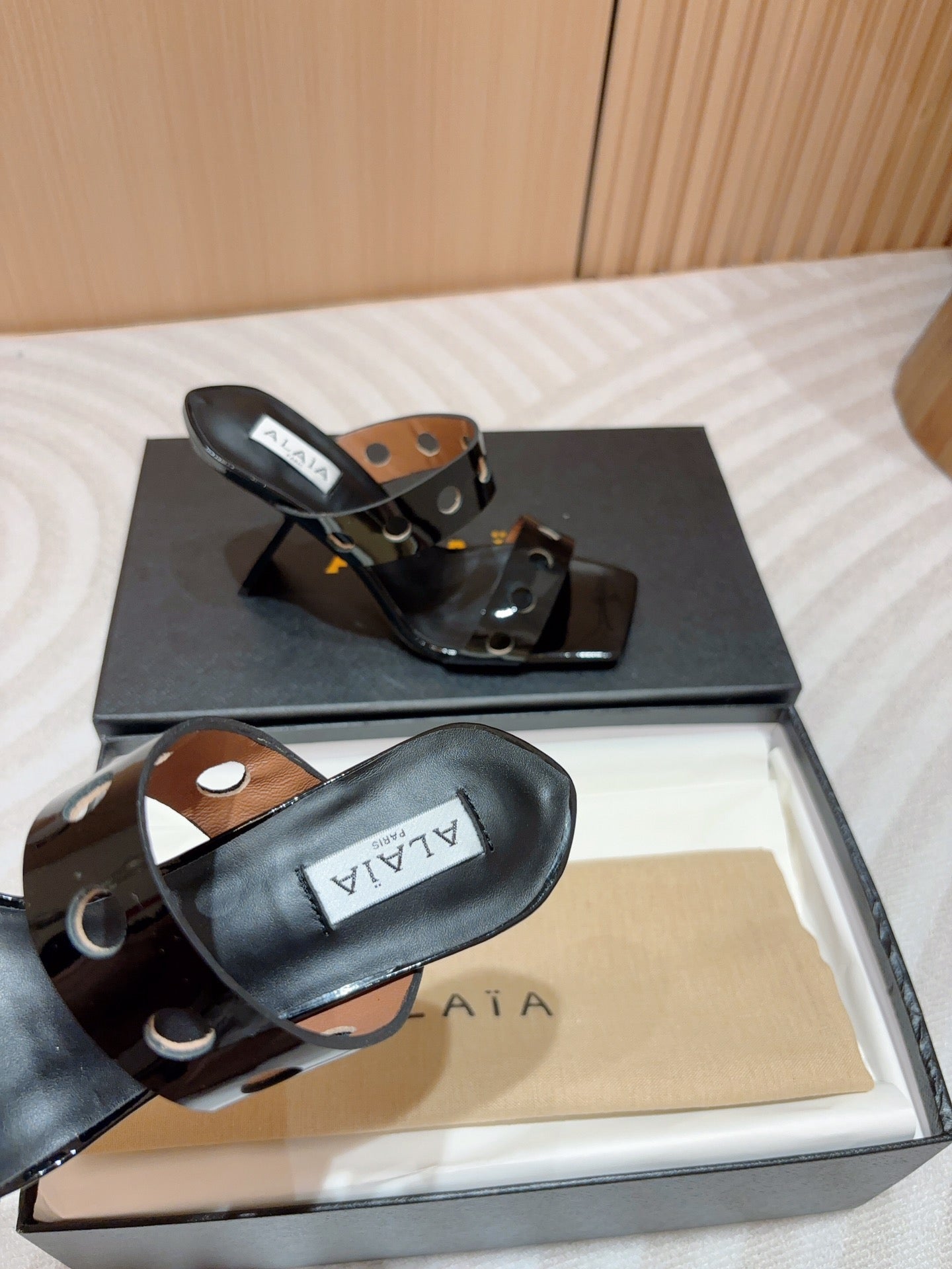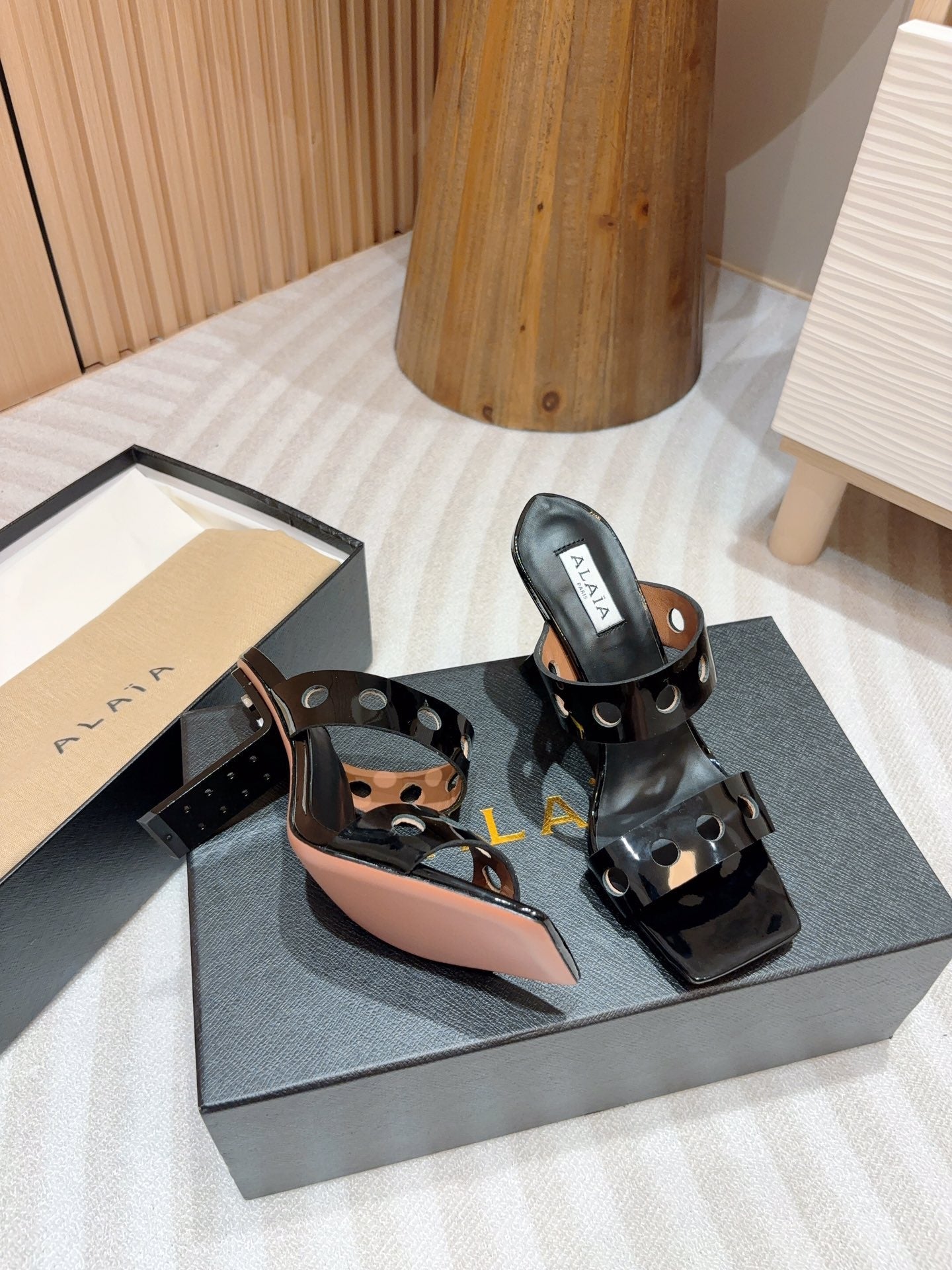 ALAIA TWO-STRAPS HIGH HEEL SANDALS IN BLACK PATENT LAMBSKIN
