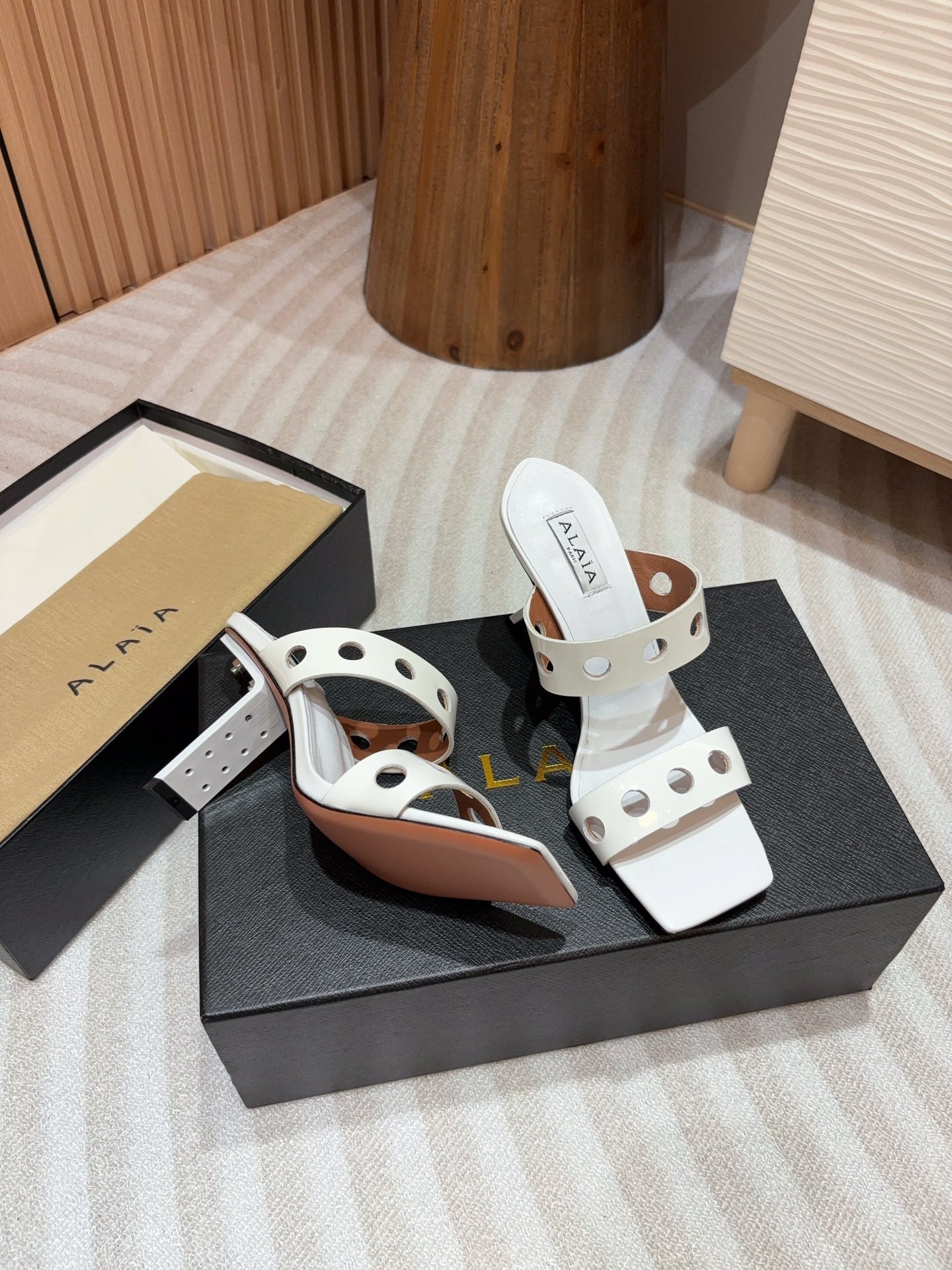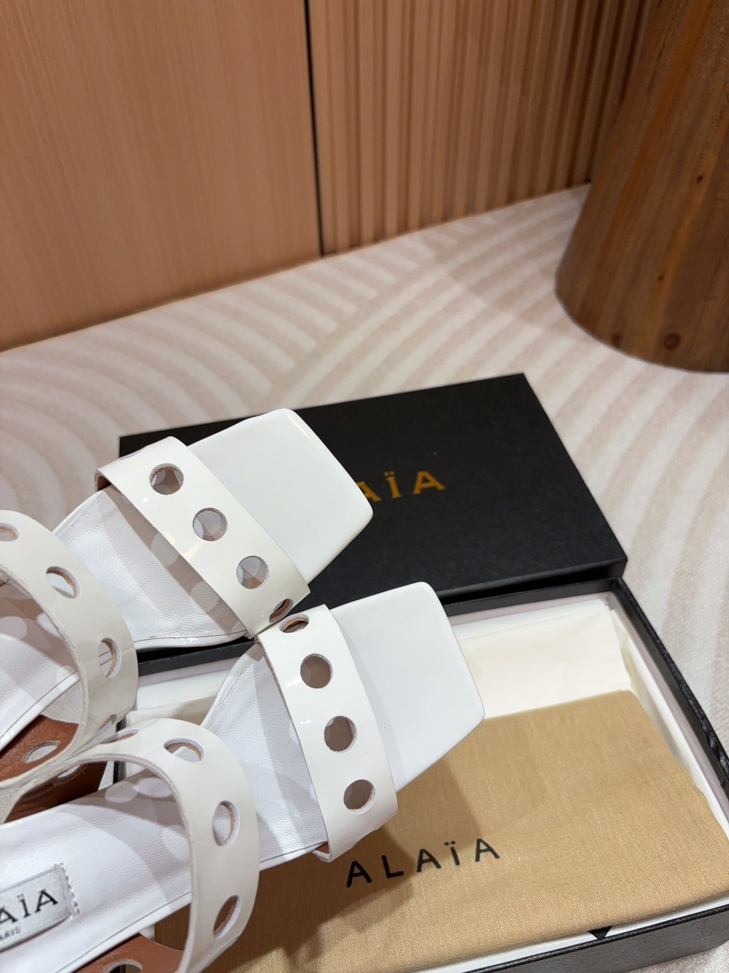 ALAIA TWO-STRAPS HIGH HEEL SANDALS IN WHITE PATENT LAMBSKIN
